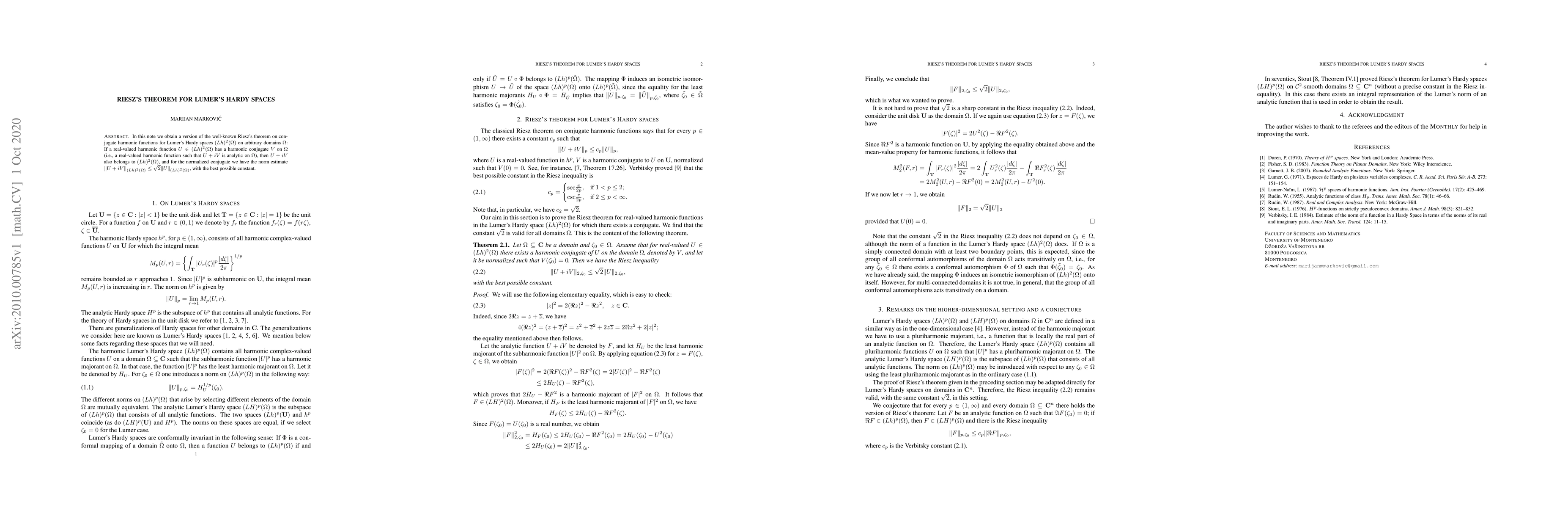 In this note we obtain a version of the well-known Riesz's theorem on conjugate harmonic functions for Lumer's Hardy spaces $(Lh)^2(\Omega)$ on arbitrary domains $\Omega$: If a real-valued harmonic function $U\in (Lh)^2(\Omega)$ has a harmonic conjugate $V$ on $\Omega$ (i.e., a real-valued harmonic function such that $U+ iV$ is analytic on $\Omega$), then $U+iV$ also belongs to $(Lh)^2(\Omega)$, and for the normalized conjugate we have the norm estimate $\|U+iV\|_{(Lh)^2(\Omega)}\le\sqrt{2} \|U\|_{(Lh)^2(\Omega)}$, with the best possible constant.