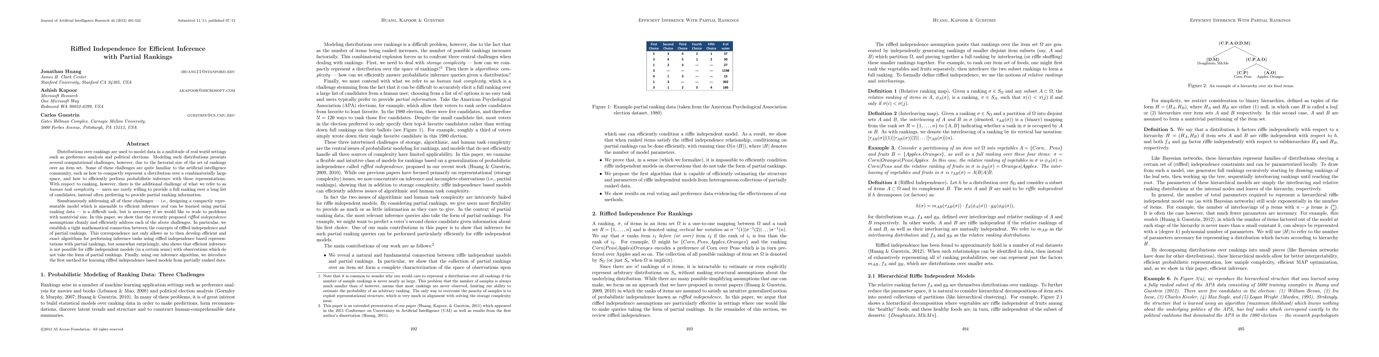 This paper proposes riffled independence assumptions to model distributions over rankings efficiently, addressing the challenges of compact representation and probabilistic inference. It establishes a connection between riffled independence and partial rankings, enabling efficient inference and introducing a method for learning these models from partial ranking data.