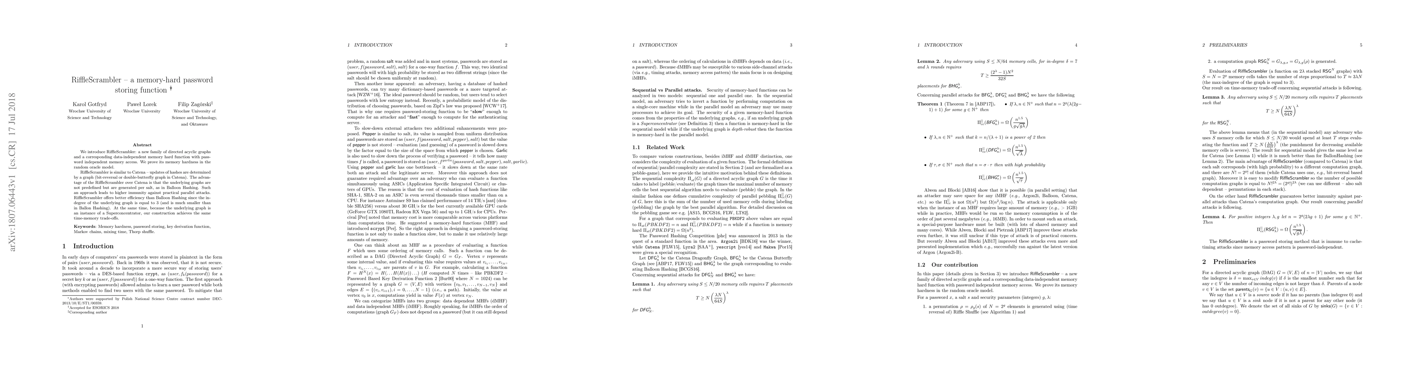 RiffleScrambler introduces a new memory-hard password storing function based on dynamically generated directed acyclic graphs, offering improved efficiency and higher immunity against parallel attacks compared to similar schemes like Catena and Balloon Hashing. The function achieves optimal time-memory trade-offs through its unique graph structure.