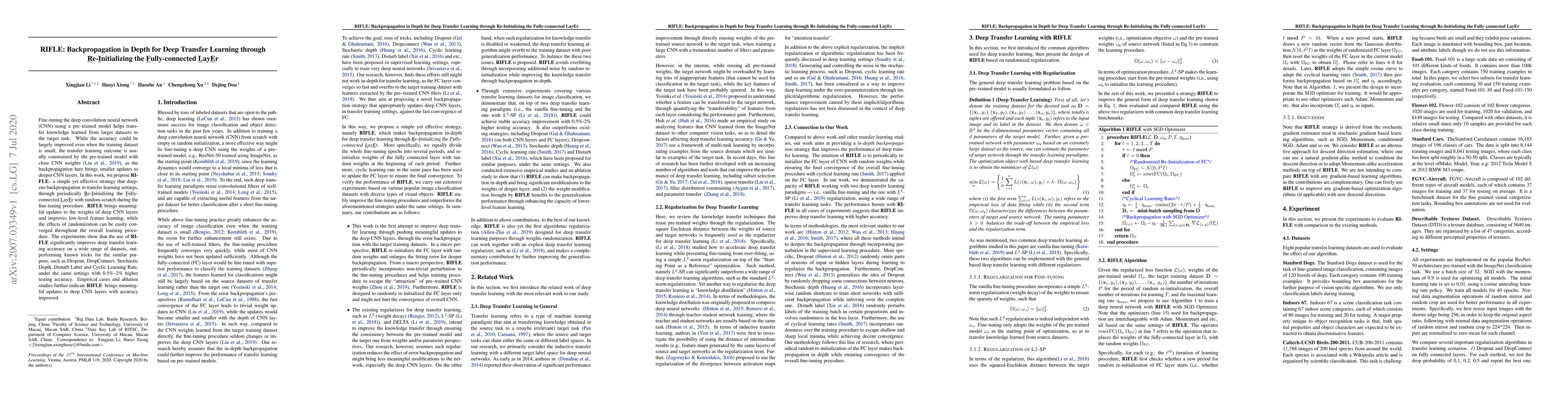 Title: RIFLE: Backpropagation in Depth for Deep Transfer Learning through Re-Initializing the Fully-connected LayEr Summary: RIFLE enhances deep transfer learning by periodically re-initializing fully-connected layers during fine-tuning, leading to significant improvements in accuracy across various datasets, outperforming other techniques like Dropout and StochasticDepth.