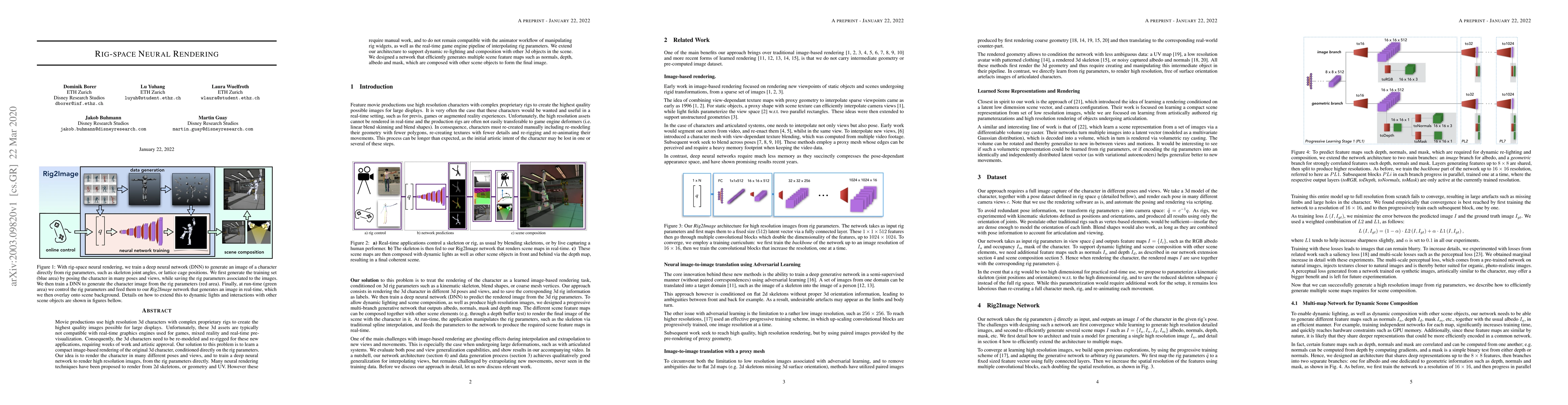Movie productions use high resolution 3d characters with complex proprietary rigs to create the highest quality images possible for large displays. Unfortunately, these 3d assets are typically not compatible with real-time graphics engines used for games, mixed reality and real-time pre-visualization. Consequently, the 3d characters need to be re-modeled and re-rigged for these new applications, requiring weeks of work and artistic approval. Our solution to this problem is to learn a compact image-based rendering of the original 3d character, conditioned directly on the rig parameters. Our idea is to render the character in many different poses and views, and to train a deep neural network to render high resolution images, from the rig parameters directly. Many neural rendering techniques have been proposed to render from 2d skeletons, or geometry and UV maps. However these require manual work, and to do not remain compatible with the animator workflow of manipulating rig widgets, as well as the real-time game engine pipeline of interpolating rig parameters. We extend our architecture to support dynamic re-lighting and composition with other 3d objects in the scene. We designed a network that efficiently generates multiple scene feature maps such as normals, depth, albedo and mask, which are composed with other scene objects to form the final image.