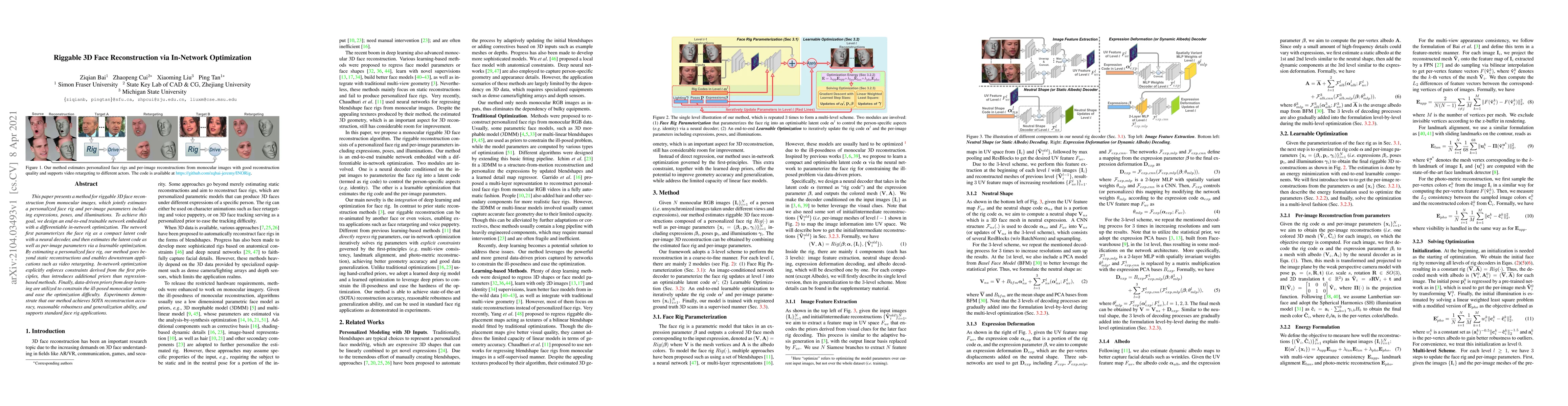 This paper presents a method for riggable 3D face reconstruction from monocular images, which jointly estimates a personalized face rig and per-image parameters including expressions, poses, and illuminations. To achieve this goal, we design an end-to-end trainable network embedded with a differentiable in-network optimization. The network first parameterizes the face rig as a compact latent code with a neural decoder, and then estimates the latent code as well as per-image parameters via a learnable optimization. By estimating a personalized face rig, our method goes beyond static reconstructions and enables downstream applications such as video retargeting. In-network optimization explicitly enforces constraints derived from the first principles, thus introduces additional priors than regression-based methods. Finally, data-driven priors from deep learning are utilized to constrain the ill-posed monocular setting and ease the optimization difficulty. Experiments demonstrate that our method achieves SOTA reconstruction accuracy, reasonable robustness and generalization ability, and supports standard face rig applications.