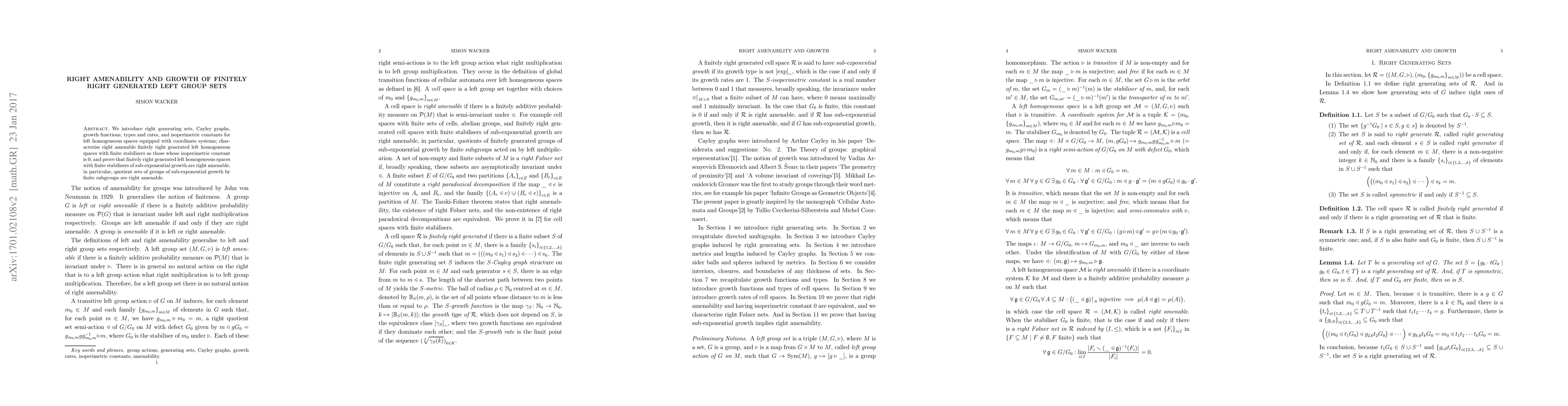 We introduce right generating sets, Cayley graphs, growth functions, types and rates, and isoperimetric constants for left homogeneous spaces equipped with coordinate systems; characterise right amenable finitely right generated left homogeneous spaces with finite stabilisers as those whose isoperimetric constant is $0$; and prove that finitely right generated left homogeneous spaces with finite stabilisers of sub-exponential growth are right amenable, in particular, quotient sets of groups of sub-exponential growth by finite subgroups are right amenable.