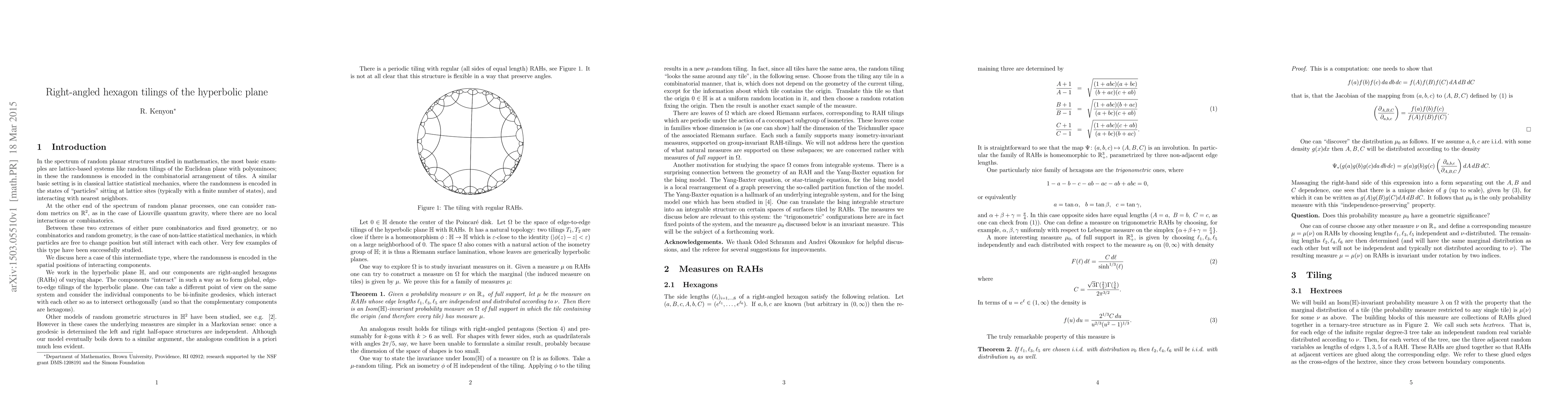 The paper studies isometry-invariant probability measures on tilings of the hyperbolic plane with right-angled hexagons of varying shapes, proving the existence of such measures for a certain family of measures on right-angled hexagons.