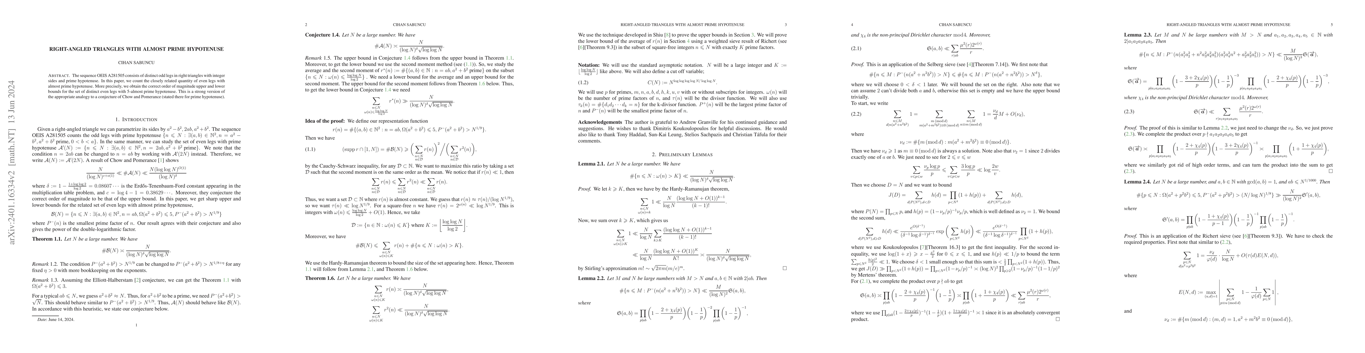The sequence OEIS A281505 consists of distinct odd legs in right triangles with integer sides and prime hypotenuse. In this paper, we count the closely related quantity of even legs with almost prime hypotenuse. More precisely, we obtain the correct order of magnitude upper and lower bounds for the set of distinct even legs with 5-almost prime hypotenuse. This is a strong version of the appropriate analogy to a conjecture of Chow and Pomerance (stated there for prime hypotenuse).