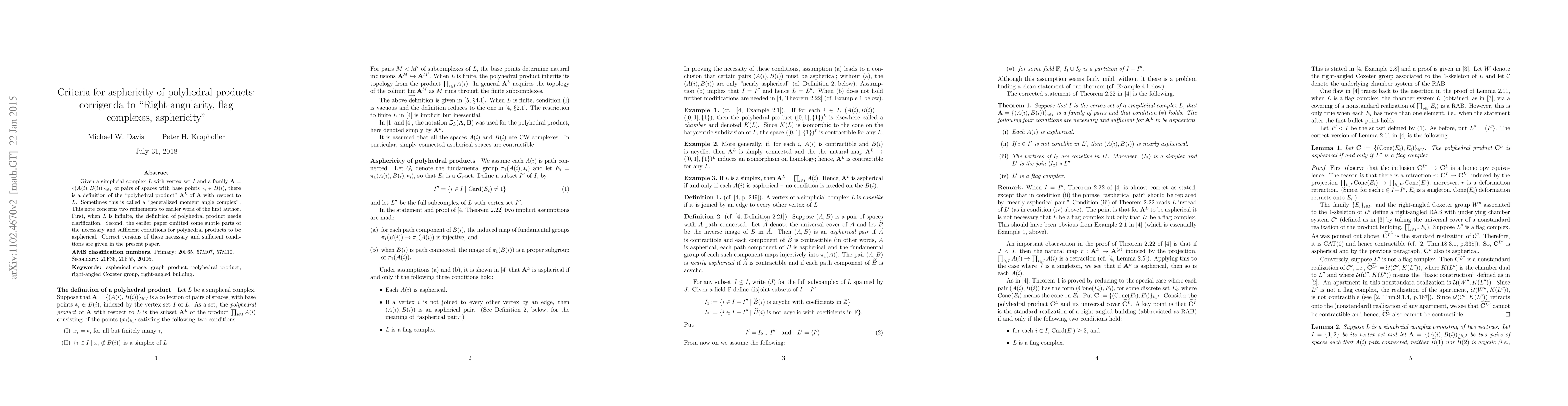 The "polyhedral product functor" produces a space from a simplicial complex L and a collection of pairs of spaces, {(A(i),B(i))}, where i ranges over the vertex set of L. We give necessary and sufficient conditions for the resulting space to be aspherical. There are two similar constructions, each of which starts with a space X and a collection of subspaces, {X_i} and then produces a new space. We give conditions for the results of these constructions to be aspherical. All three techniques can be used to produce examples of closed aspherical manifolds. Abstract for Corrigenda: This note concerns two refinements to the earlier work by the first author. First, when L is infinite, the definition of polyhedral product needs clarification. Second, the earlier paper omitted some subtle parts of the necessary and sufficient conditions for polyhedral products to be aspherical. Correct versions of these necessary and sufficient conditions are given in the present paper.