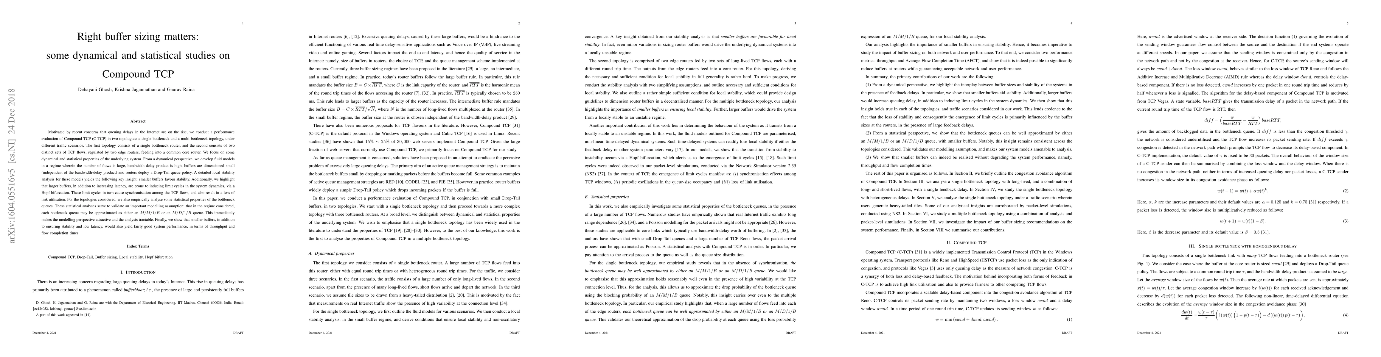 This paper evaluates the performance of Compound TCP (C-TCP) in two network topologies, finding that smaller buffers enhance stability and reduce latency while avoiding limit cycles and synchronisation issues among TCP flows. Statistical analyses validate the model's assumptions and show that smaller buffers also maintain good throughput and flow completion times.