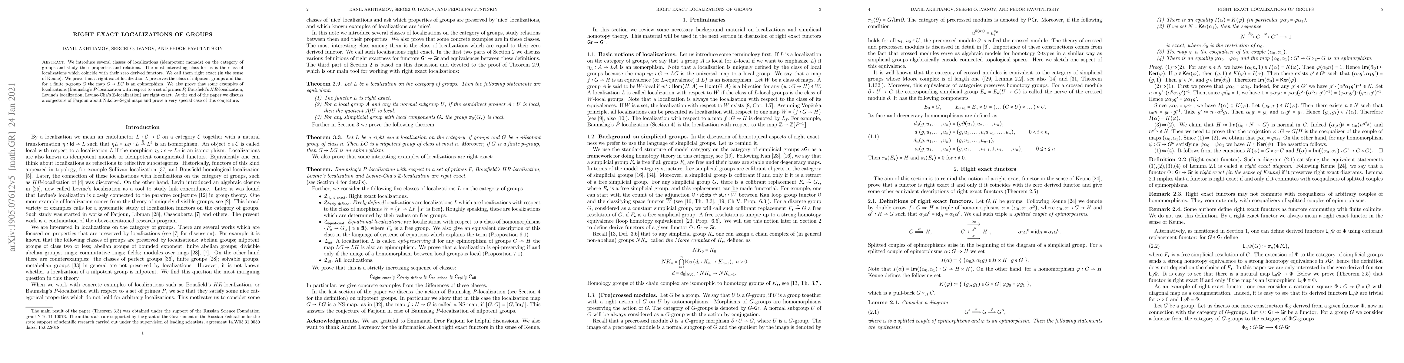 This paper introduces classes of localizations on groups that preserve nilpotent groups and discusses several examples of right exact localizations, including Baumslag's $P$-localization and Levine-Cha's $oxed{ ext{Z}}$-localization.