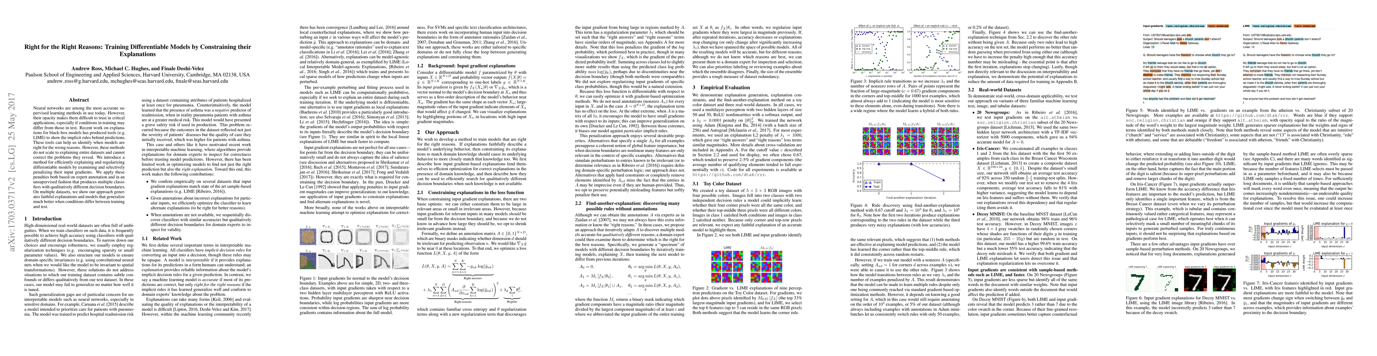 Neural networks are among the most accurate supervised learning methods in use today, but their opacity makes them difficult to trust in critical applications, especially when conditions in training differ from those in test. Recent work on explanations for black-box models has produced tools (e.g. LIME) to show the implicit rules behind predictions, which can help us identify when models are right for the wrong reasons. However, these methods do not scale to explaining entire datasets and cannot correct the problems they reveal. We introduce a method for efficiently explaining and regularizing differentiable models by examining and selectively penalizing their input gradients, which provide a normal to the decision boundary. We apply these penalties both based on expert annotation and in an unsupervised fashion that encourages diverse models with qualitatively different decision boundaries for the same classification problem. On multiple datasets, we show our approach generates faithful explanations and models that generalize much better when conditions differ between training and test.