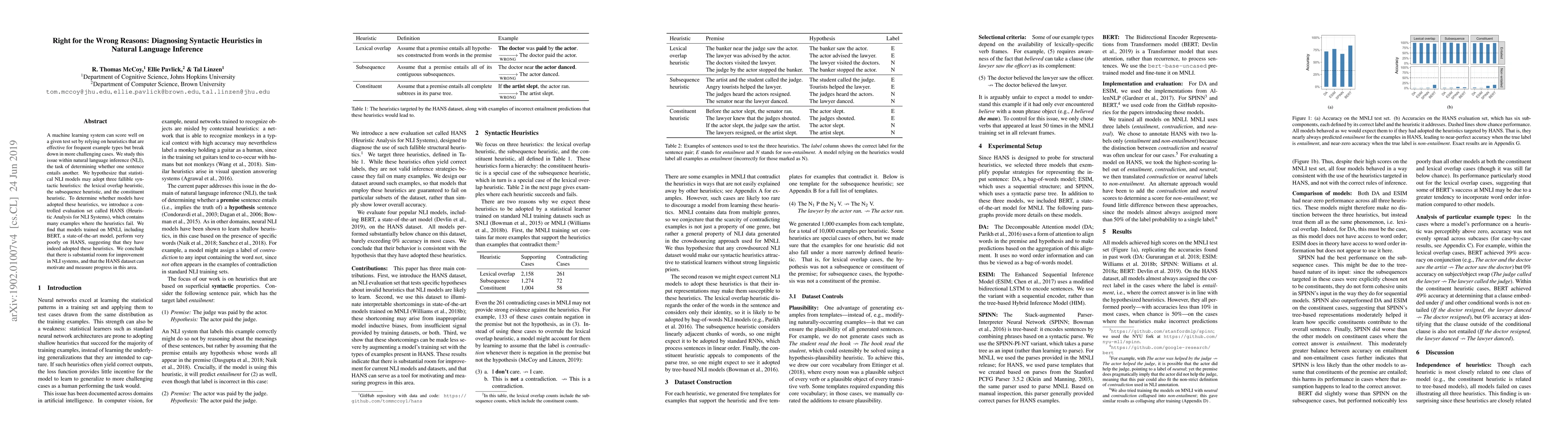 A machine learning system can score well on a given test set by relying on heuristics that are effective for frequent example types but break down in more challenging cases. We study this issue within natural language inference (NLI), the task of determining whether one sentence entails another. We hypothesize that statistical NLI models may adopt three fallible syntactic heuristics: the lexical overlap heuristic, the subsequence heuristic, and the constituent heuristic. To determine whether models have adopted these heuristics, we introduce a controlled evaluation set called HANS (Heuristic Analysis for NLI Systems), which contains many examples where the heuristics fail. We find that models trained on MNLI, including BERT, a state-of-the-art model, perform very poorly on HANS, suggesting that they have indeed adopted these heuristics. We conclude that there is substantial room for improvement in NLI systems, and that the HANS dataset can motivate and measure progress in this area