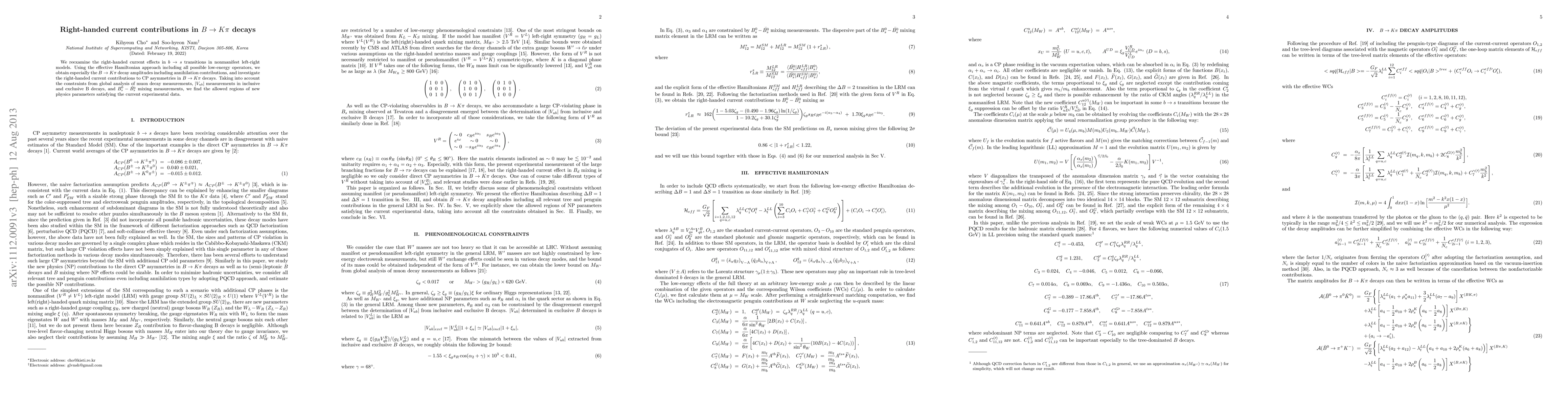 We reexamine the right-handed current effects in $b \to s$ transitions in nonmanifest left-right models. Using the effective Hamiltonian approach including all possible low-energy operators, we obtain especially the B \to K \pi decay amplitudes including annihilation contributions, and investigate the right-handed current contributions to CP asymmetries in $B \to K \pi$ decays. Taking into account the constraints from global analysis of muon decay measurements, |V_{ub}| measurements in inclusive and exclusive B decays, and $B_s^0-\bar{B_s^0}$ mixing measurements, we find the allowed regions of new physics parameters satisfying the current experimental data.