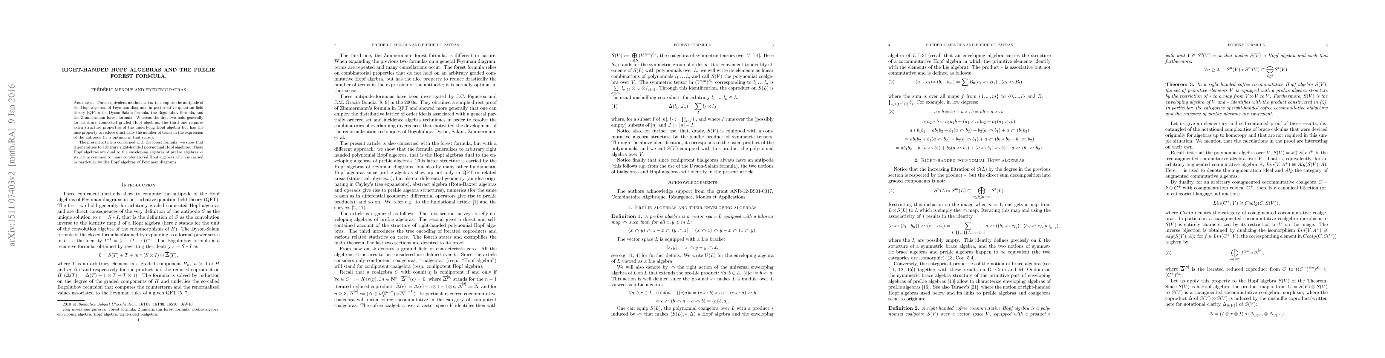 This paper extends the Zimmermann forest formula to compute the antipode in right-handed Hopf algebras, demonstrating its application to Hopf algebras of Feynman diagrams in quantum field theory. It shows the formula’s optimality by reducing the number of terms and links these Hopf algebras to preLie algebras through their dual relationship.