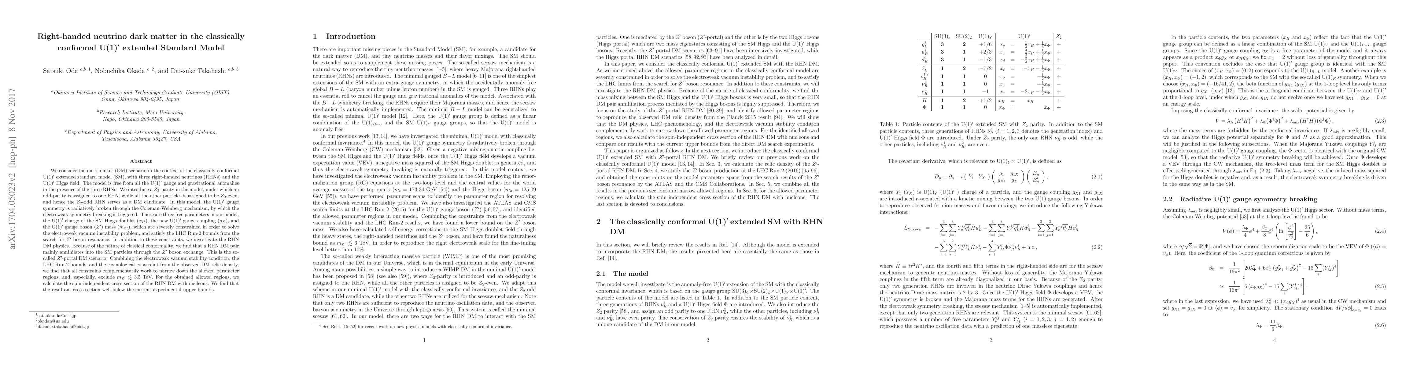 This paper explores a dark matter scenario in a classically conformal U(1)' extended Standard Model featuring three right-handed neutrinos, where one serves as a $Z_2$-odd dark matter candidate. The model's parameters are constrained by electroweak stability, LHC bounds, and relic density, leading to a $Z'$-portal annihilation mechanism and a DM cross section below experimental limits.