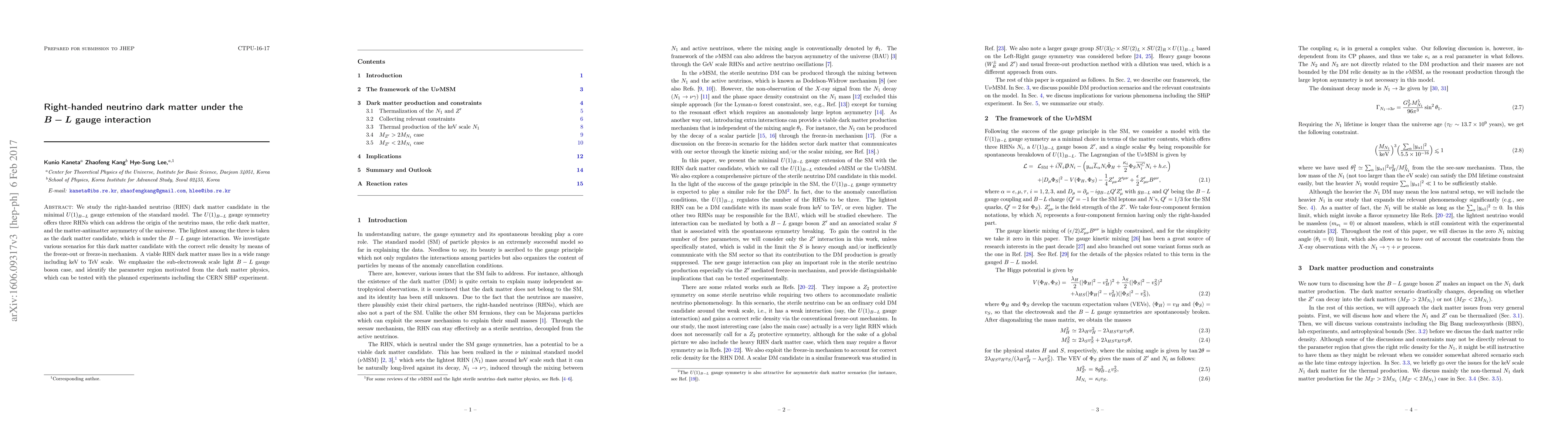 This paper explores right-handed neutrino dark matter in the context of the U(1)_{B-L} gauge extension of the Standard Model, where the lightest right-handed neutrino serves as a dark matter candidate. It investigates viable mass ranges and interaction scenarios, emphasizing the sub-electroweak scale B-L gauge boson, and highlights testable parameter regions for future experiments like CERN SHiP.