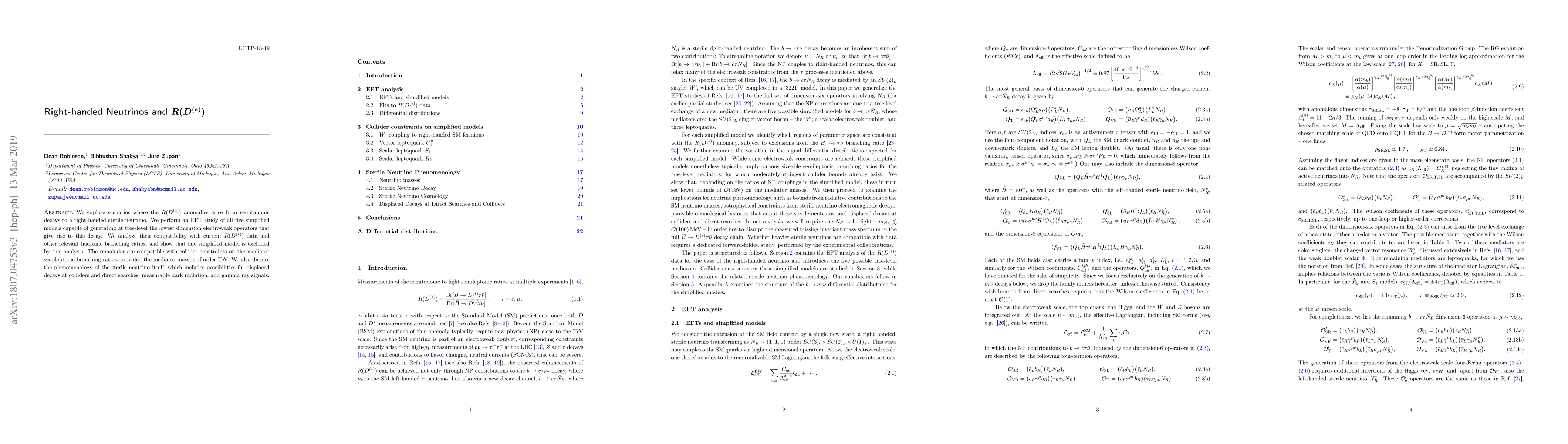 We explore scenarios where the $R(D^{(*)})$ anomalies arise from semitauonic decays to a right-handed sterile neutrino. We perform an EFT study of all five simplified models capable of generating at tree-level the lowest dimension electroweak operators that give rise to this decay. We analyze their compatibility with current $R(D^{(*)})$ data and other relevant hadronic branching ratios, and show that one simplified model is excluded by this analysis. The remainder are compatible with collider constraints on the mediator semileptonic branching ratios, provided the mediator mass is of order TeV. We also discuss the phenomenology of the sterile neutrino itself, which includes possibilities for displaced decays at colliders and direct searches, measurable dark radiation, and gamma ray signals.