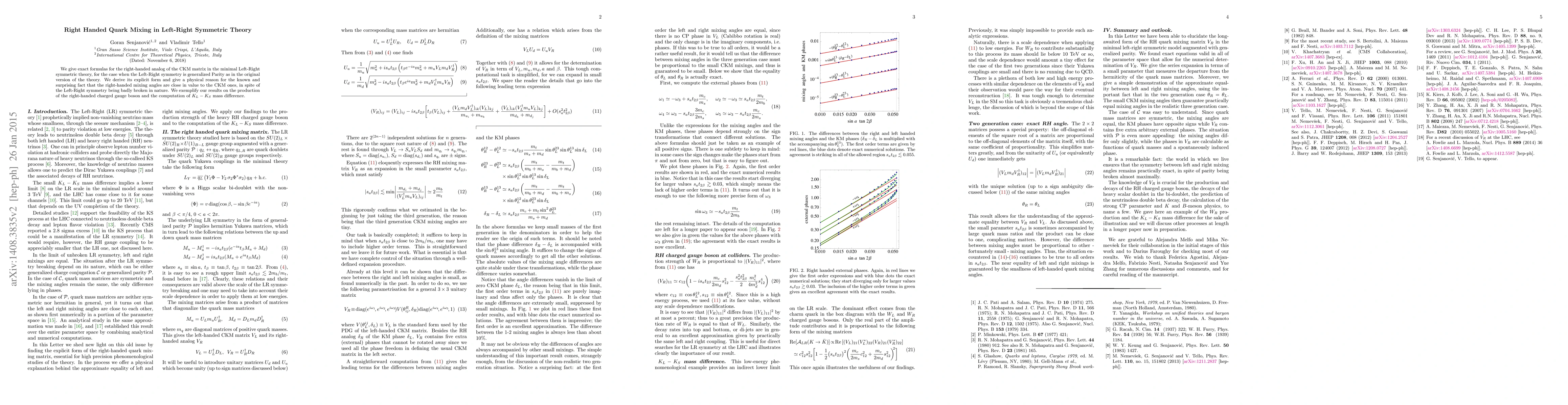 This paper provides exact formulas for the right-handed quark mixing matrix in minimal Left-Right symmetric theory, explaining why the right-handed mixing angles resemble the CKM matrix despite the broken symmetry. It also applies these findings to the production of right-handed gauge bosons and neutral K meson mass difference calculations.
