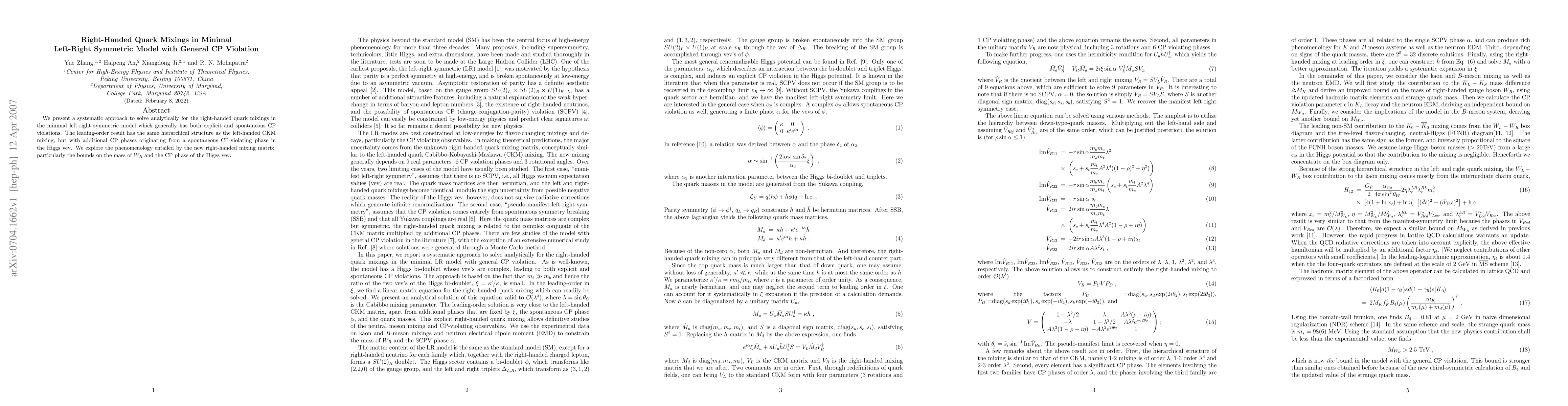We present a systematic approach to solve analytically for the right-handed quark mixings in the minimal left-right symmetric model which generally has both explicit and spontaneous CP violations. The leading-order result has the same hierarchical structure as the left-handed CKM mixing, but with additional CP phases originating from a spontaneous CP-violating phase in the Higgs vev. We explore the phenomenology entailed by the new right-handed mixing matrix, particularly the bounds on the mass of $W_R$ and the CP phase of the Higgs vev.