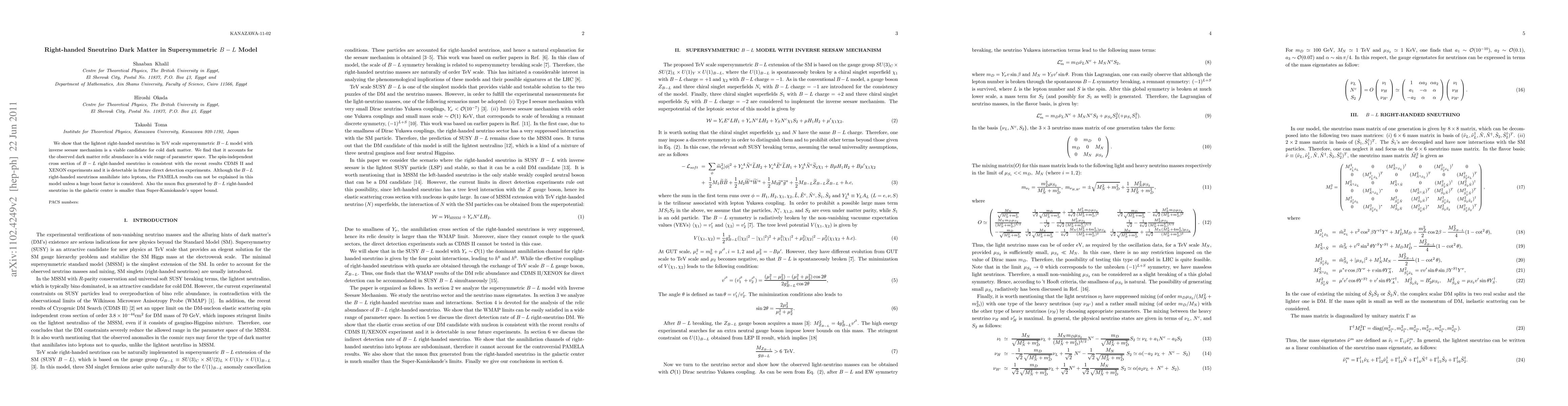 This paper proposes the lightest right-handed sneutrino in a supersymmetric B-L model with the inverse seesaw mechanism as a viable candidate for cold dark matter, consistent with observed relic abundance and direct detection experiments. However, the model cannot explain PAMELA's results without a large boost factor, and the muon flux from the galactic center is below Super-Kamiokande's limits.