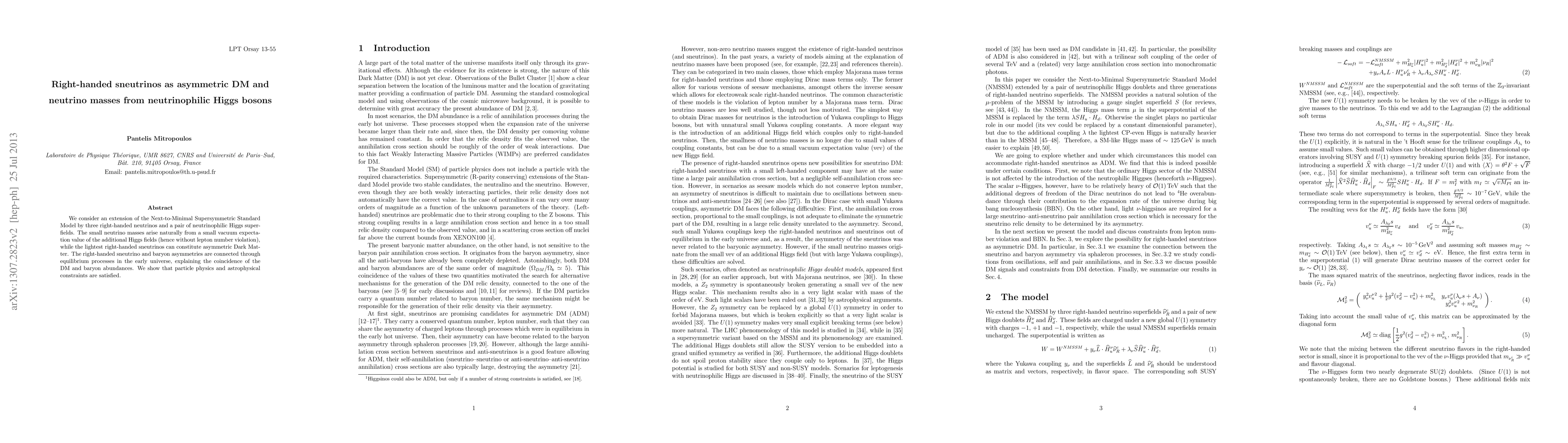 This paper extends the Next-to-Minimal Supersymmetric Standard Model with right-handed neutrinos and neutrinophilic Higgs bosons, explaining small neutrino masses via small vacuum expectation values without lepton number violation. It proposes that the lightest right-handed sneutrinos serve as asymmetric Dark Matter, with the connection between sneutrino and baryon asymmetries in the early universe explaining the observed coincidence of their abundances.