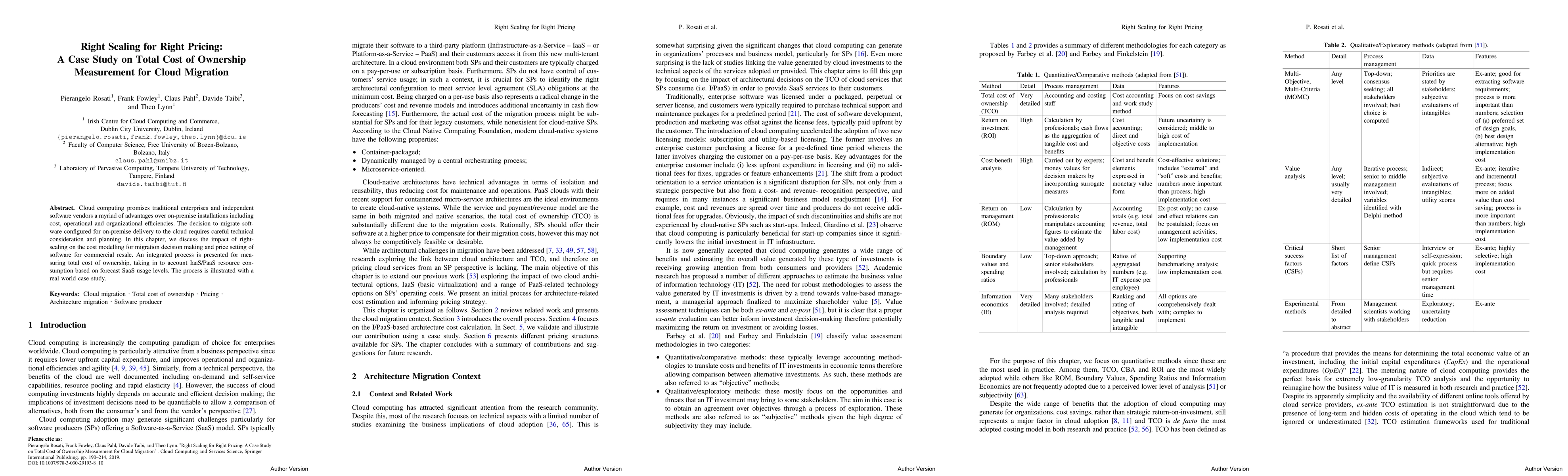 Cloud computing promises traditional enterprises and independent software vendors a myriad of advantages over on-premise installations including cost, operational and organizational efficiencies. The decision to migrate software configured for on-premise delivery to the cloud requires careful technical consideration and planning. In this chapter, we discuss the impact of right-scaling on the cost modelling for migration decision making and price setting of software for commercial resale. An integrated process is presented for measuring total cost of ownership, taking in to account IaaS/PaaS resource consumption based on forecast SaaS usage levels. The process is illustrated with a real world case study.