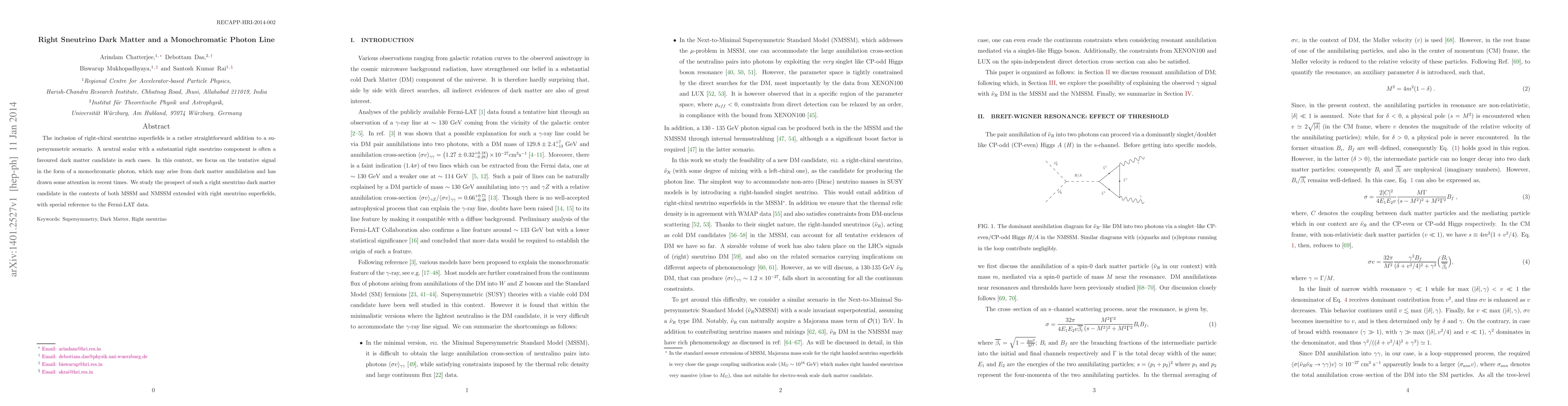 The inclusion of right-chiral sneutrino superfields is a rather straightforward addition to a supersymmetric scenario. A neutral scalar with a substantial right sneutrino component is often a favoured dark matter candidate in such cases. In this context, we focus on the tentative signal in the form of a monochromatic photon, which may arise from dark matter annihilation and has drawn some attention in recent times. We study the prospect of such a right sneutrino dark matter candidate in the contexts of both MSSM and NMSSM extended with right sneutrino superfields, with special reference to the Fermi-LAT data.