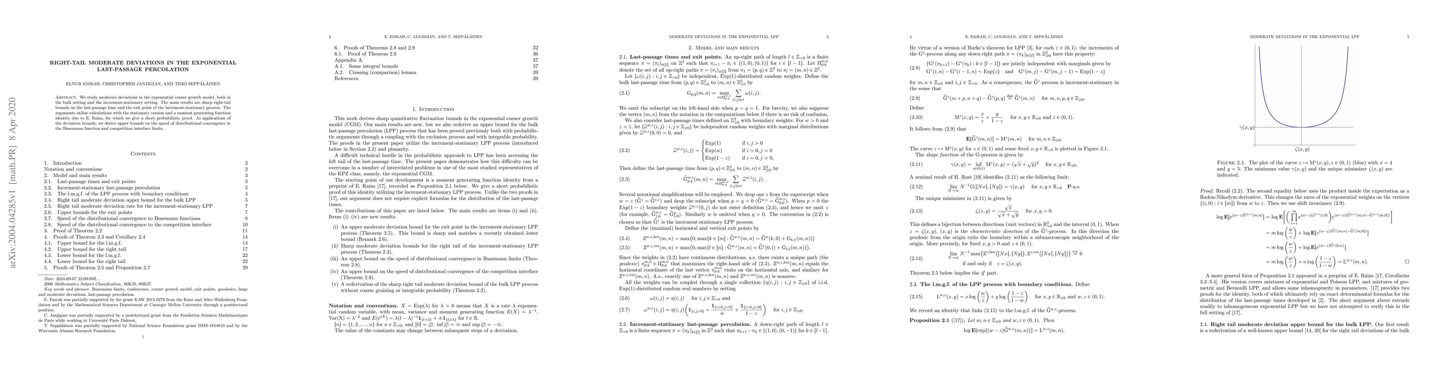 This paper investigates moderate deviations in the exponential corner growth model, providing sharp right-tail bounds on the last-passage time and exit point. It employs a probabilistic proof of a moment generating function identity to derive these bounds, which are then applied to obtain upper bounds on the speed of convergence in Busemann function and competition interface limits.