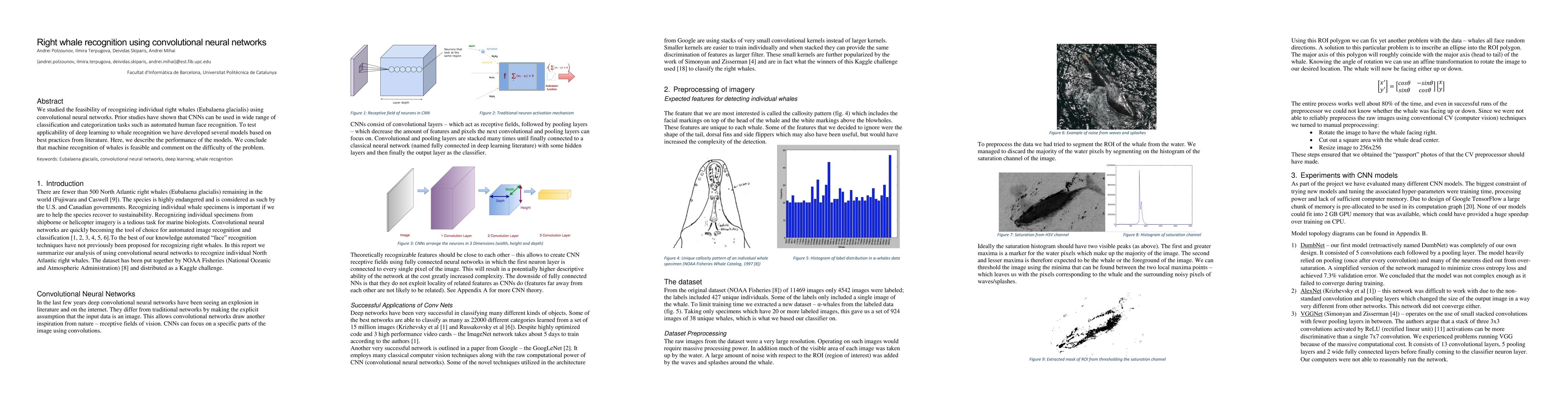 This study explores the use of convolutional neural networks (CNNs) to recognize individual right whales, demonstrating the feasibility of machine recognition and discussing the challenges of the task. The developed models show promising results, indicating the potential of deep learning for marine species identification.