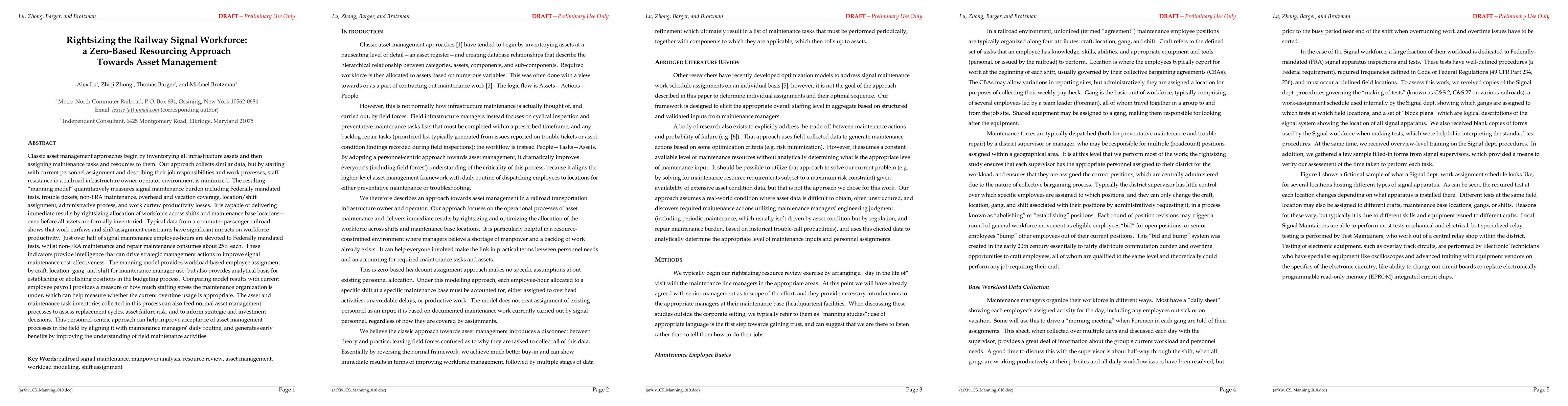 Classic asset management approaches begin by inventorying all infrastructure assets and then assigning maintenance tasks and resources. Our approach collects similar data, but by starting with current personnel assignment and describing their job responsibilities and work processes, staff resistance in a railroad infrastructure owner-operator environment is minimized. Resulting "manning model" quantitatively measures signal maintenance burden including Federally mandated tests, trouble tickets, non-FRA maintenance, overhead and vacation coverage, location/shift assignment, administrative process, and work curfew productivity losses. It is capable of delivering immediate results by rightsizing allocation of workforce across shifts and maintenance base locations--even before all assets are formally inventoried. Typical data from a commuter passenger railroad shows that work curfews and shift assignment constraints have significant impacts on workforce productivity. Just over half of signal maintenance employee-hours are devoted to Federally mandated tests, whilst non-FRA and repair maintenance consumes about 25% each. These indicators provide intelligence driving strategic management actions to improve signal maintenance cost-effectiveness. This model provides workload-based employee assignment by craft, location, gang, and shift for maintenance manager use, but also provides analytical basis for establishing or abolishing positions in the budgeting process. Comparing its results with current employee payroll provides a measure of how much staffing stress the maintenance organization is under, which can help measure whether the current overtime usage is appropriate. Asset and maintenance task inventories collected in this process can also feed normal asset management processes to assess replacement cycles, asset failure risk, and to inform strategic and investment decisions.