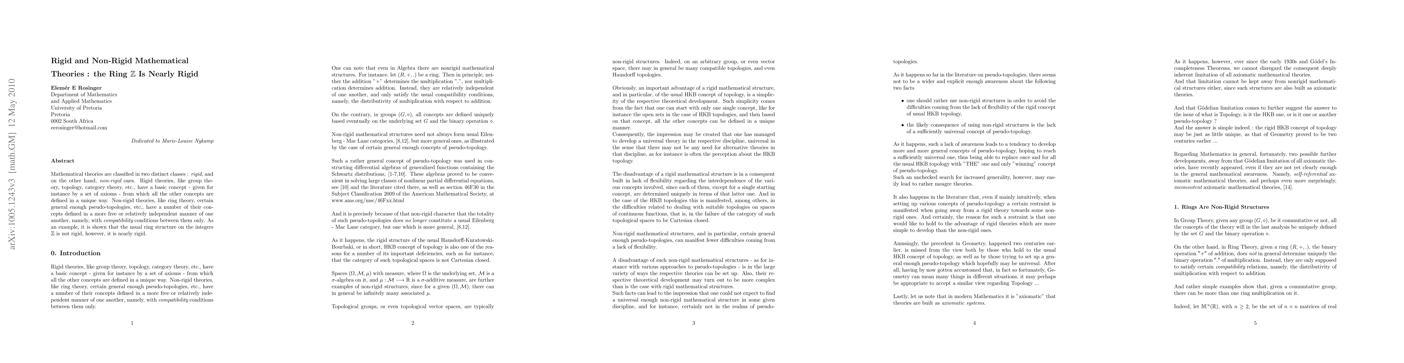 Mathematical theories are classified in two distinct classes : {\it rigid}, and on the other hand, {\it non-rigid} ones. Rigid theories, like group theory, topology, category theory, etc., have a basic concept - given for instance by a set of axioms - from which all the other concepts are defined in a unique way. Non-rigid theories, like ring theory, certain general enough pseudo-topologies, etc., have a number of their concepts defined in a more free or relatively independent manner of one another, namely, with {\it compatibility} conditions between them only. As an example, it is shown that the usual ring structure on the integers $\mathbb{Z}$ is not rigid, however, it is nearly rigid.