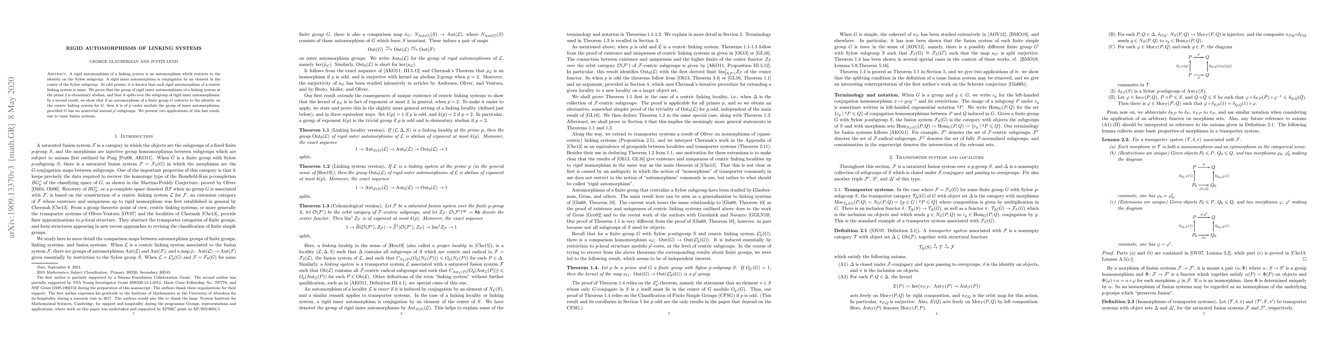 A rigid automorphism of a linking system is an automorphism which restricts to the identity on the Sylow subgroup. A rigid inner automorphism is conjugation by an element in the center of the Sylow subgroup. At odd primes, it is known that each rigid automorphism of a centric linking system is inner. We prove that the group of rigid outer automorphisms of a linking system at the prime $2$ is elementary abelian, and that it splits over the subgroup of rigid inner automorphisms. In a second result, we show that if an automorphism of a finite group $G$ restricts to the identity on the centric linking system for $G$, then it is of $p'$-order modulo the group of inner automorphisms, provided $G$ has no nontrivial normal $p'$-subgroups. We present two applications of this last result, one to tame fusion systems.