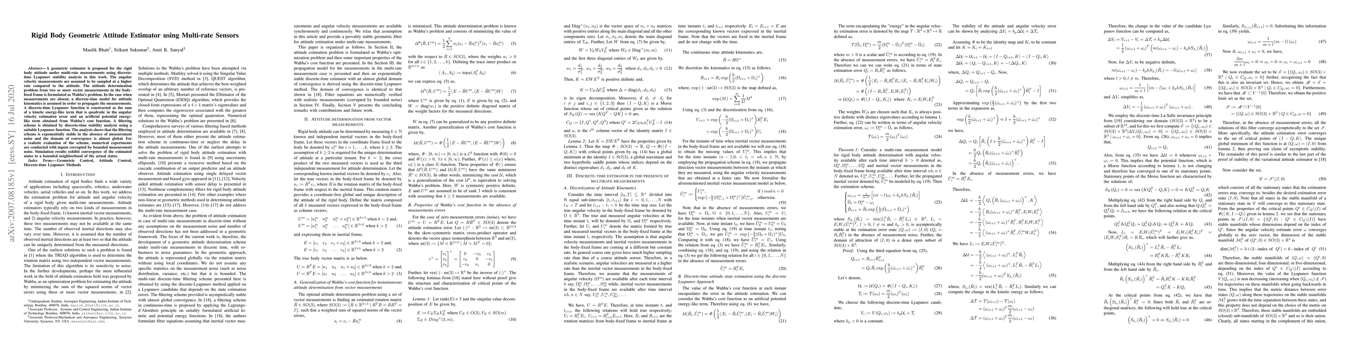 This paper proposes a geometric estimator for rigid body attitude using multi-rate sensors, employing discrete-time Lyapunov stability analysis. The estimator addresses Wahba's problem for attitude determination and demonstrates exponential stability and almost global convergence in the presence of bounded measurement noise.