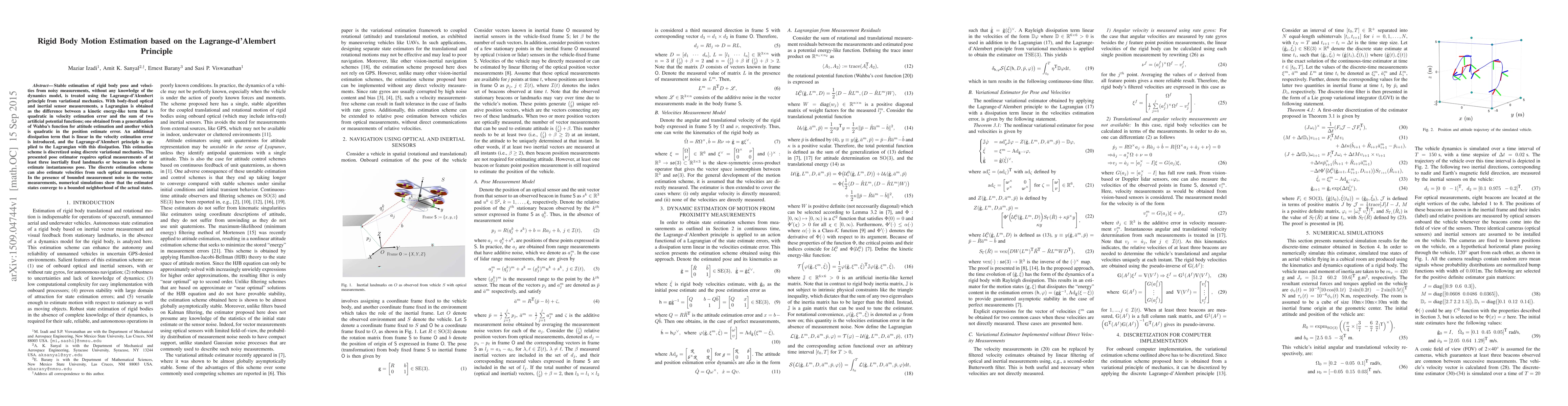 This paper proposes a rigid body motion estimation method using the Lagrange-d'Alembert principle, which estimates pose and velocity from noisy optical and inertial sensor data without requiring a dynamics model. The method converges to a bounded neighborhood of the actual states under bounded measurement noise.