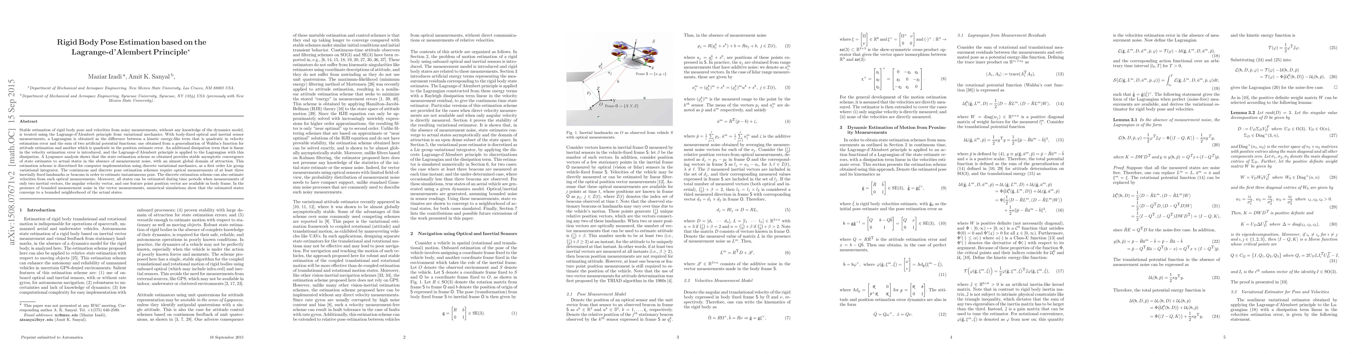 This paper proposes a method for stable rigid body pose and velocity estimation using the Lagrange-d'Alembert principle, without requiring knowledge of the dynamics model. The method employs optical and inertial sensor measurements to derive a Lagrangian and achieve stable asymptotic convergence of estimates, with simulations demonstrating robustness to bounded measurement noise.