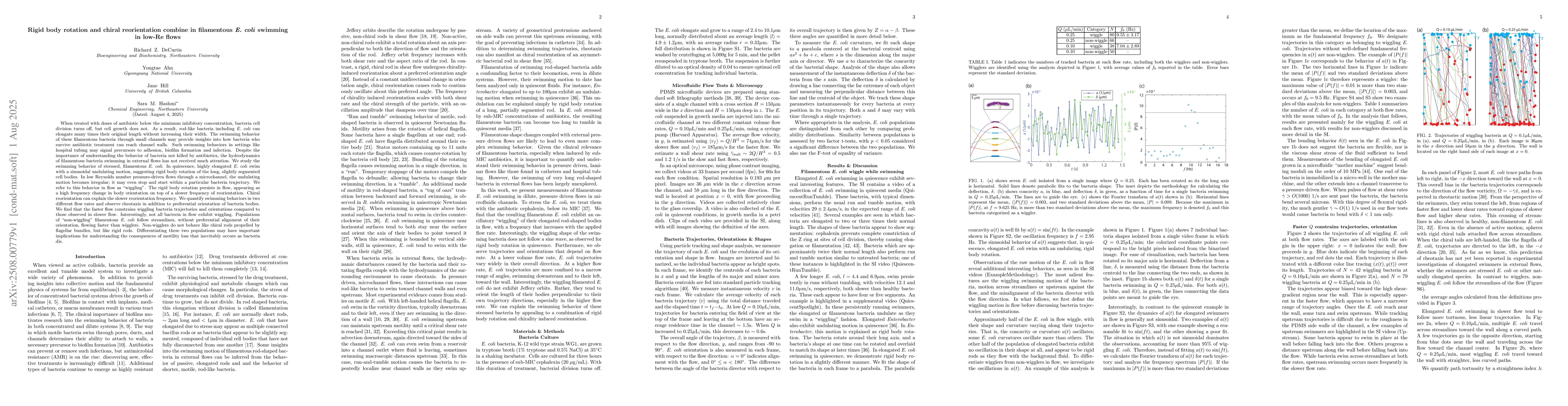 Antibiotic doses below a minimum inhibitory concentration turn off bacteria cell division, but not cell growth. As a result, rod-like bacteria including E. coli can elongate many times their original length without increasing their width. The swimming behavior of these filamentous bacteria through small channels may provide insights into how antibiotic-resistant bacteria swim to channel walls. Such swimming behaviors in settings like hospital tubing may facilitate adhesion, biofilm formation and infection. Despite the importance of understanding the behavior of bacteria not killed by antibiotics, the swimming of filamentous bacteria in external flows has not received much attention. We study the swimming of stressed, filamentous E. coli. In quiescence, highly elongated E. coli swim with a sinusoidal undulation, suggesting rigid body rotation of the long, slightly segmented cell bodies. In low Reynolds number pressure-driven flows through a microchannel, undulation becomes irregular and may stop and start within a particular bacteria trajectory. We refer to this behavior in flow as `wiggling.' Rigid body rotation persists in flow, appearing as a high frequency change in body orientation on top of a slower frequency of reorientation. Chiral reorientation can explain the slower reorientation. We quantify swimming in two flow rates and observe both rheotaxis and preferential orientation of bacteria bodies. We find that the faster flow constrains wiggling bacteria trajectories and orientations more than slower flow does. Interestingly, not all bacteria in flow wiggle. Populations of `non-wiggling' filamentous E. coli follow streamlines, without preferential orientation, flowing faster than wigglers. Non-wigglers do not behave like chiral rods propelled by flagellar bundles, but like rigid rods. Differentiating these populations may have important implications for understanding motility loss.