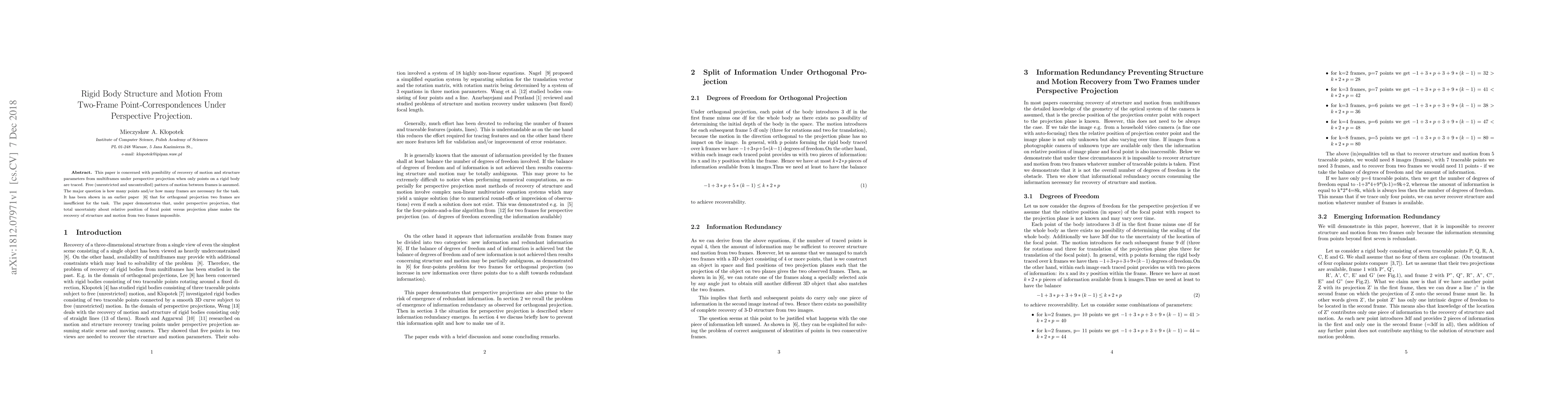 This paper is concerned with possibility of recovery of motion and structure parameters from multiframes under perspective projection when only points on a rigid body are traced. Free (unrestricted and uncontrolled) pattern of motion between frames is assumed. The major question is how many points and/or how many frames are necessary for the task. It has been shown in an earlier paper {Klopotek:95b} that for orthogonal projection two frames are insufficient for the task. The paper demonstrates that, under perspective projection, that total uncertainty about relative position of focal point versus projection plane makes the recovery of structure and motion from two frames impossible.