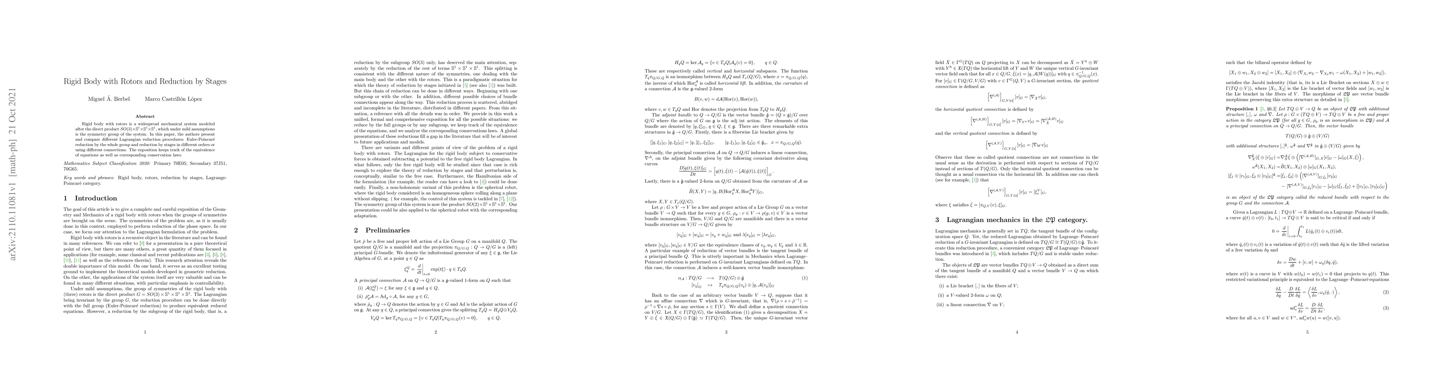 This paper explores the Lagrangian reduction methods for a rigid body with rotors, comparing Euler-Poincaré reduction and staged reductions, while maintaining equivalence of equations and conservation laws throughout the analysis.