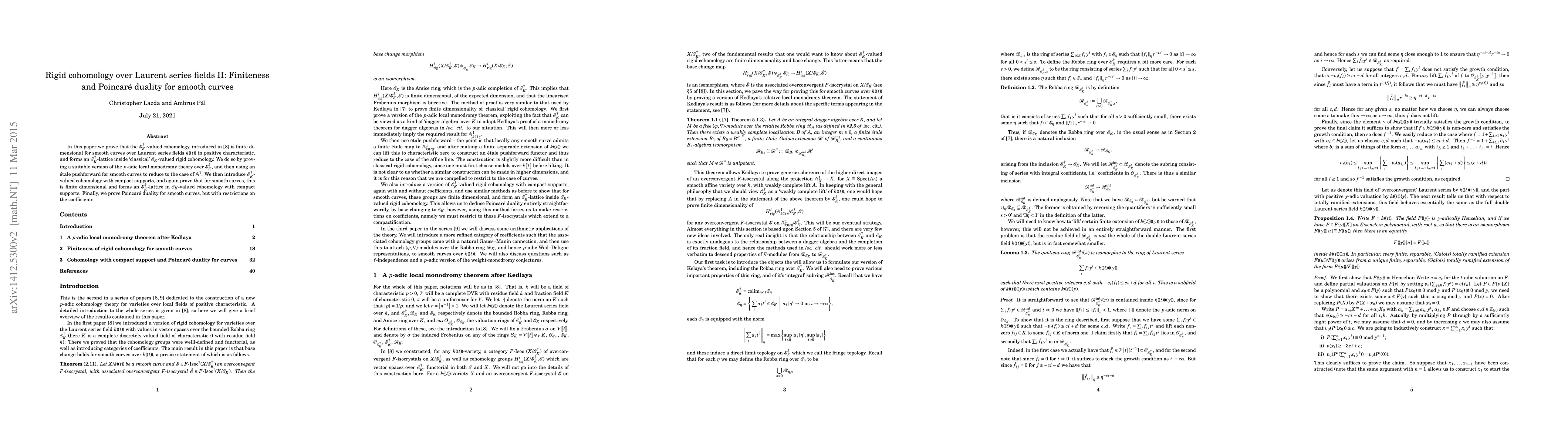 In this paper we prove that the $\mathcal{E}^\dagger_K$-valued cohomology, introduced in [9] is finite dimensional for smooth curves over Laurent series fields $k((t))$ in positive characteristic, and forms an $\mathcal{E}^\dagger_K$-lattice inside `classical' $\mathcal{E}_K$-valued rigid cohomology. We do so by proving a suitable version of the p-adic local monodromy theory over $\mathcal{E}^\dagger_K$, and then using an \'{e}tale pushforward for smooth curves to reduce to the case of $\mathbb{A}^1$. We then introduce $\mathcal{E}^\dagger_K$-valued cohomology with compact supports, and again prove that for smooth curves, this is finite dimensional and forms an $\mathcal{E}^\dagger_K$-lattice in $\mathcal{E}_K$-valued cohomology with compact supports. Finally, we prove Poincar\'{e} duality for smooth curves, but with restrictions on the coefficients.