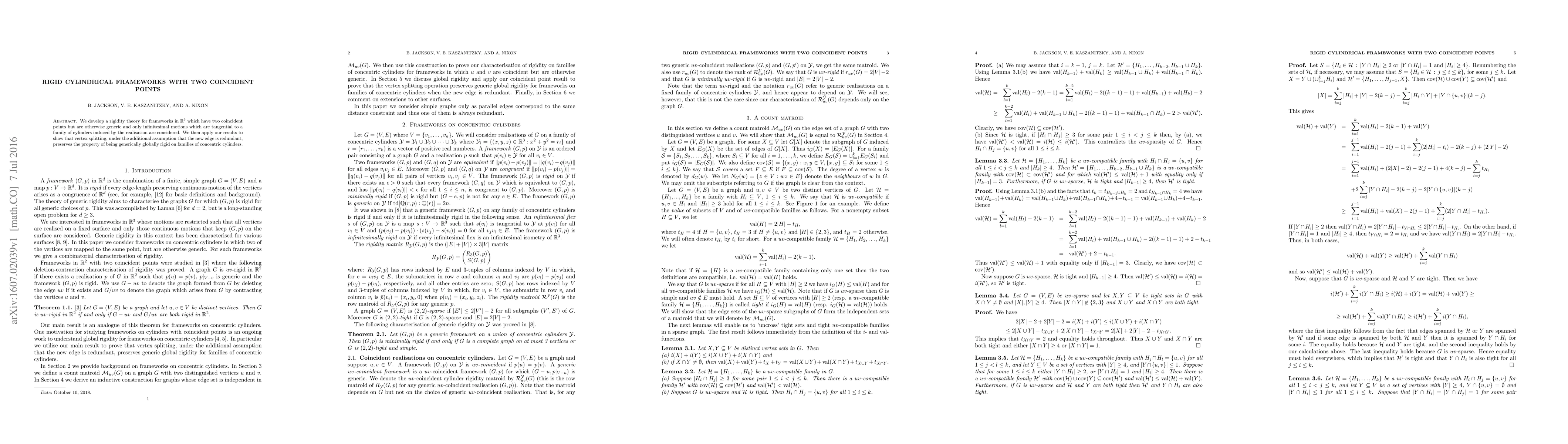 This research develops a rigidity theory for generic 3D frameworks with two coincident points, showing that vertex splitting preserves global rigidity under specific conditions, particularly for families of concentric cylinders.