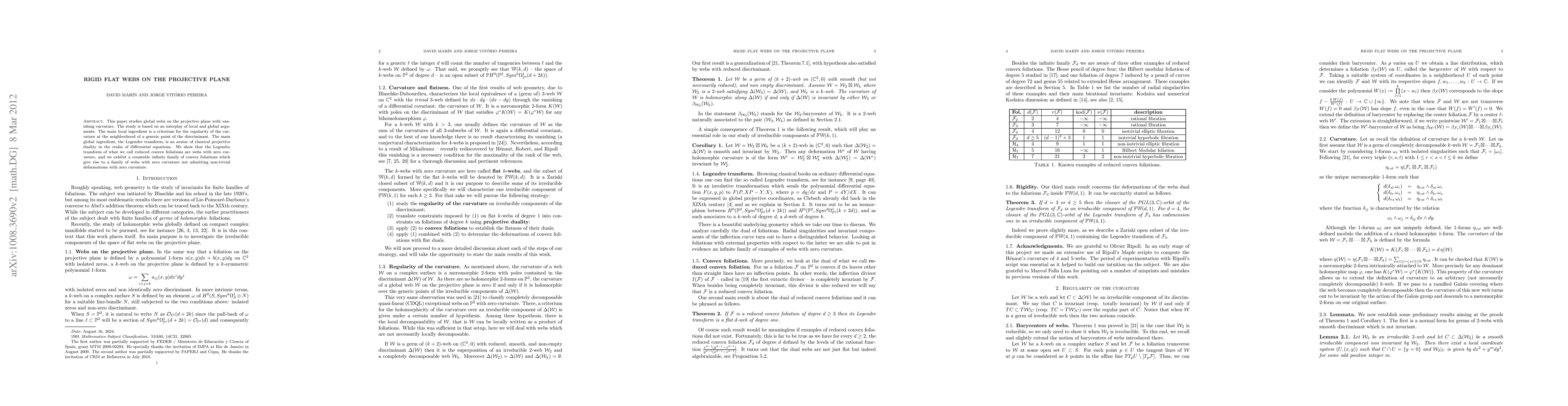 This paper investigates global webs on the projective plane with zero curvature, employing both local criteria for curvature regularity and global techniques like the Legendre transform. It demonstrates that certain reduced convex foliations yield rigid flat webs, showcasing a family of such webs that cannot be deformed while maintaining zero curvature.