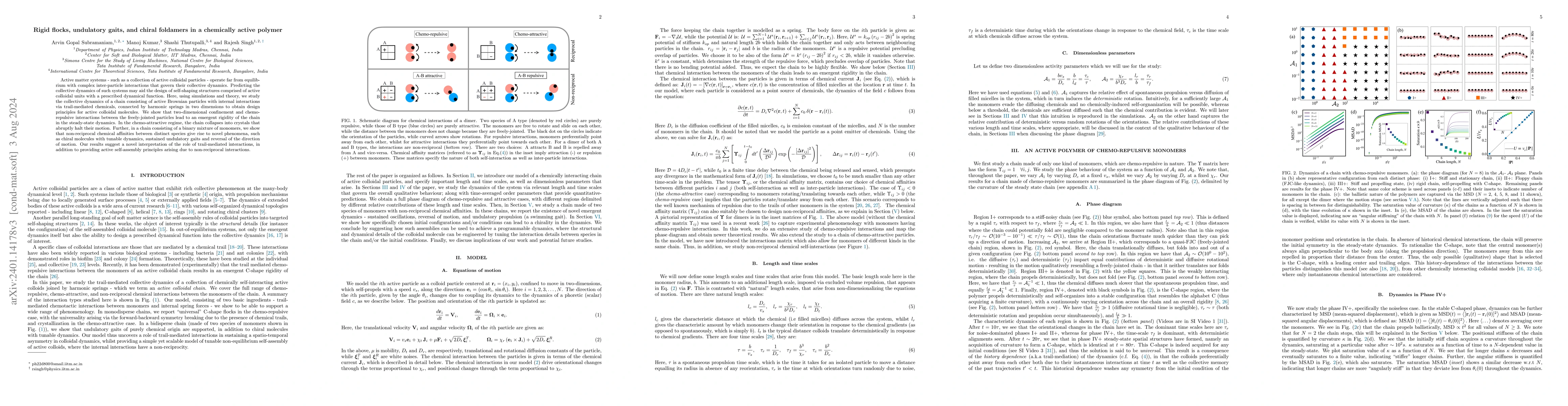 This paper investigates the collective dynamics of active colloidal chains with internal chemical interactions, revealing emergent rigidity and chiral foldamers. It finds that chemo-repulsive interactions induce chain rigidity, while chemo-attractive forces cause the chain to collapse, leading to novel phenomena like undulatory gaits and direction reversal in binary mixtures.