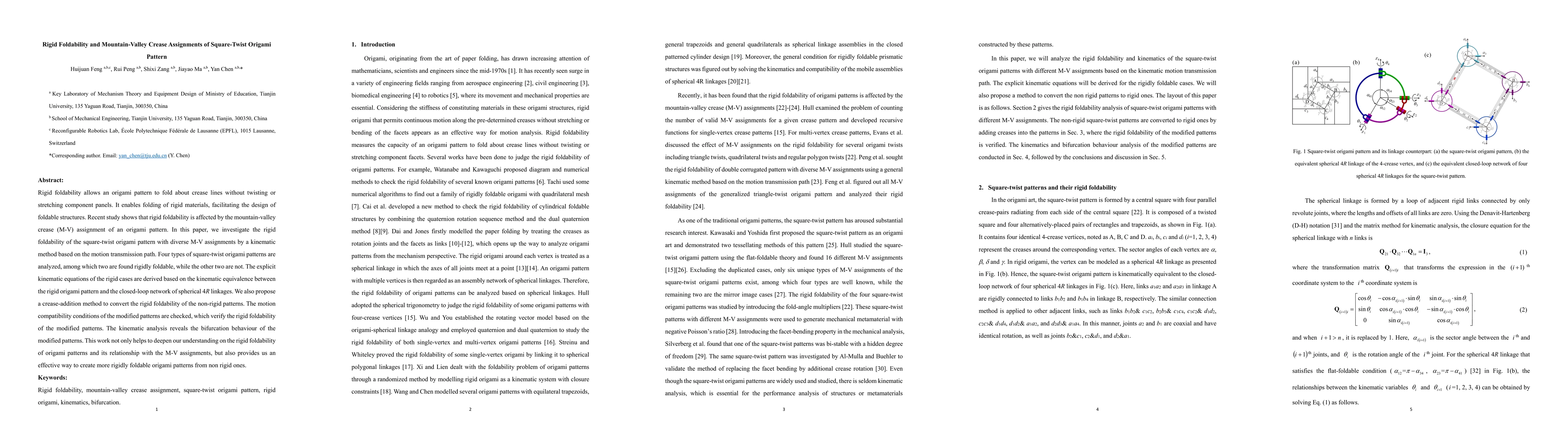 This paper investigates the rigid foldability of square-twist origami patterns under various mountain-valley crease assignments, identifying two rigidly foldable patterns and two non-rigid ones. It proposes a method to convert non-rigid patterns into rigid ones, demonstrating the kinematic equivalence and motion compatibility.