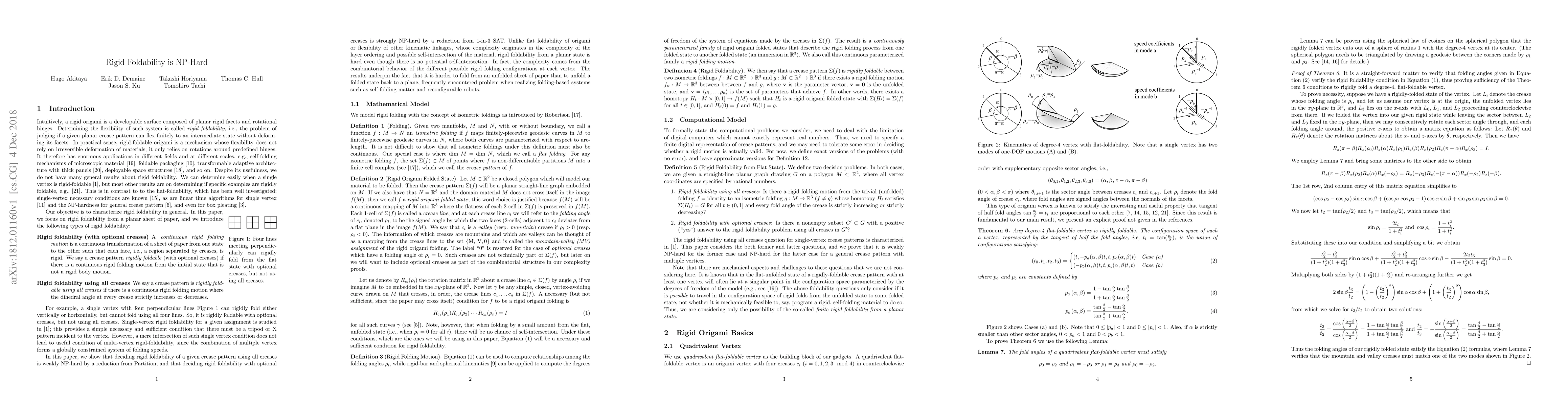 This paper demonstrates that determining the rigid foldability of a crease pattern is weakly NP-hard, even without self-intersection, due to combinatorial folding configurations. The problem's difficulty is illustrated by showing its equivalence to Partition and 1-in-3 SAT, highlighting the challenge in folding systems like self-folding matter and reconfigurable robots.