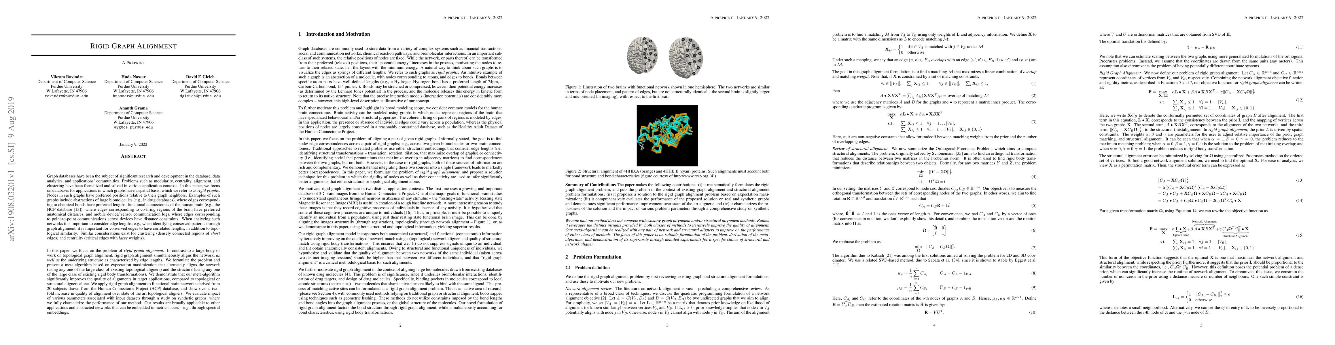 Graph databases have been the subject of significant research and development. Problems such as modularity, centrality, alignment, and clustering have been formalized and solved in various application contexts. In this paper, we focus on databases for applications in which graphs have a spatial basis, which we refer to as rigid graphs. Nodes in such graphs have preferred positions relative to their graph neighbors. Examples of such graphs include abstractions of large biomolecules, functional connectomes of the human brain, and mobile device/ sensor communication logs. When analyzing such networks it is important to consider edge lengths; e.g., when identifying conserved patterns through graph alignment, it is important for conserved edges to have correlated lengths, in addition to topological similarity. In contrast to a large body of work on topological graph alignment, rigid graph alignment simultaneously aligns the network, as well as the underlying structure as characterized by edge lengths. We formulate the problem and present a meta-algorithm based on expectation-maximization that alternately aligns the network and the structure. We demonstrate that our meta-algorithm significantly improves the quality of alignments in target applications, compared to topological or structural aligners alone. We apply rigid graph alignment to functional brain networks derived from 20 subjects drawn from the Human Connectome Project (HCP) database, and show over a two-fold increase in quality of alignment over state of the art topological aligners. We evaluate the impact of various parameters associated with input datasets through a study on synthetic graphs, where we fully characterize the performance of our method. Our results are broadly applicable to other applications and abstracted networks that can be embedded in metric spaces -- e.g., through spectral embeddings.