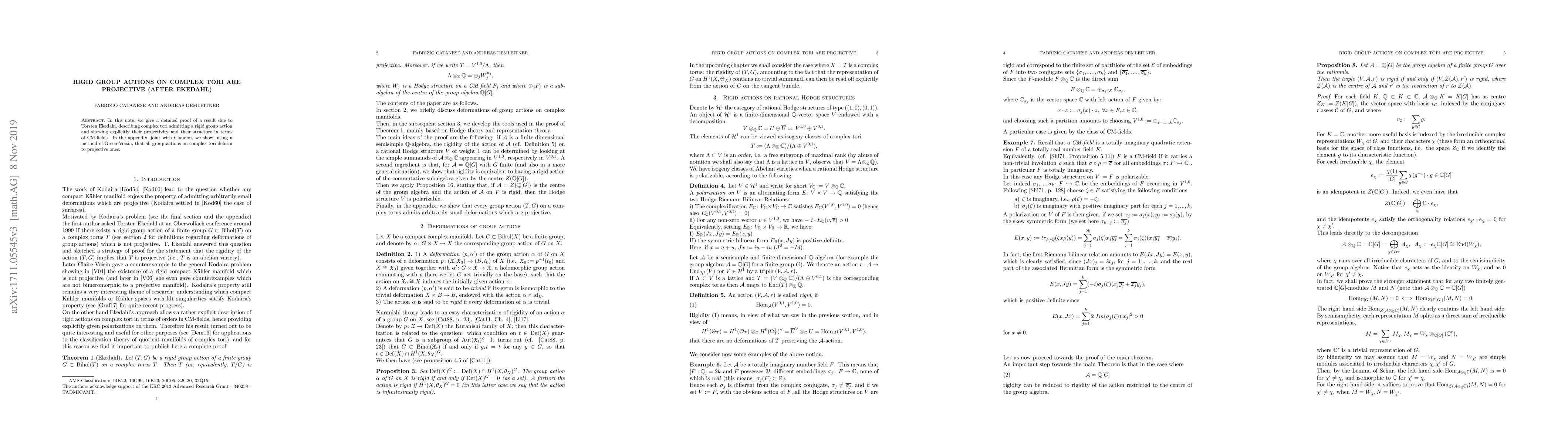 In this note we give a detailed proof of a result (sketched by Torsten Ekedahl in a discussion with the first author several years ago), describing complex tori admitting a rigid group action and showing explicitly their projectivity and their structure in terms of CM-fields. In the appendix, joint with Benoit Claudon, we show, using a method of Green-Voisin, that all group actions on complex tori deform to projective ones.