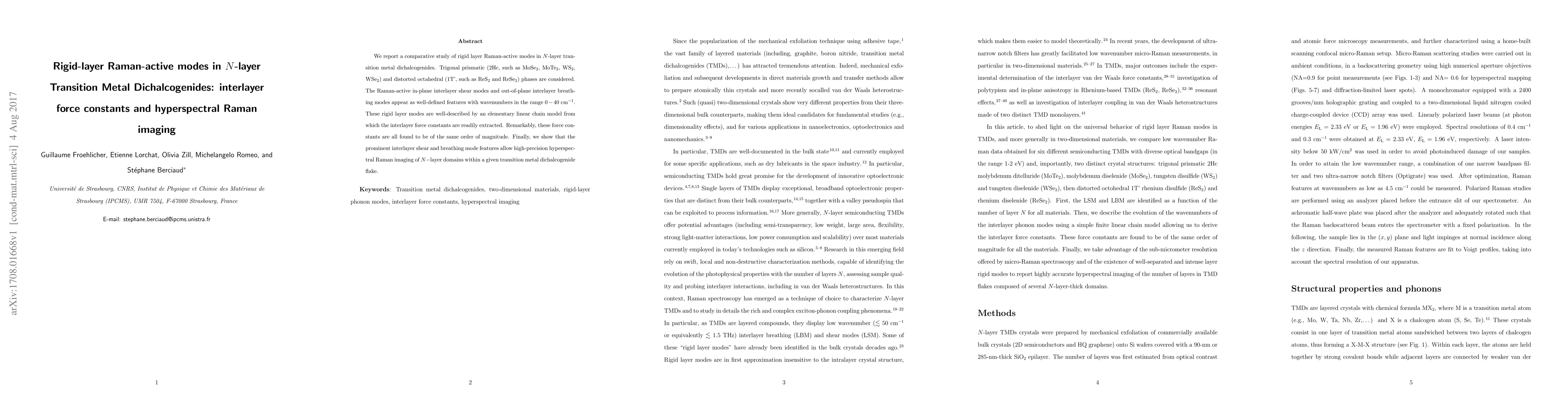 This paper investigates rigid-layer Raman-active modes in $N$-layer transition metal dichalcogenides, revealing consistent interlayer force constants across different phases and demonstrating high-precision hyperspectral Raman imaging capabilities for layer domain analysis.