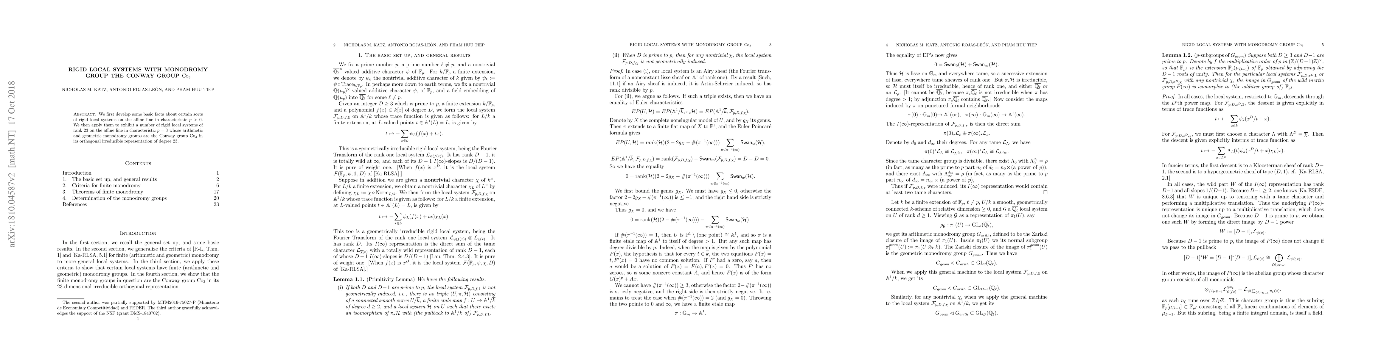 We first develop some basic facts about certain sorts of rigid local systems on the affine line in characteristic $p>0$. We then apply them to exhibit a number of rigid local systems of rank $23$ on the affine line in characteristic $p=3$ whose arithmetic and geometric monodromy groups are the Conway group $\mathrm{Co}_3$ in its orthogonal irreducible representation of degree $23$.