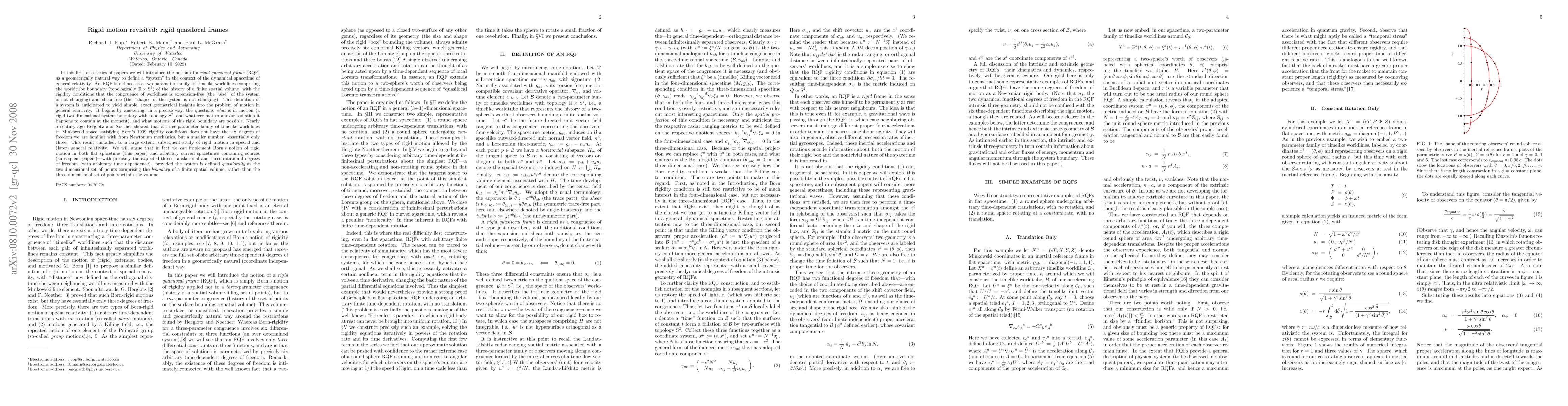 We introduce the notion of a rigid quasilocal frame (RQF) as a geometrically natural way to define a "system" in general relativity. An RQF is defined as a two-parameter family of timelike worldlines comprising the worldtube boundary of the history of a finite spatial volume, with the rigidity conditions that the congruence of worldlines is expansion-free (constant size) and shear-free (constant shape). This definition of a system is anticipated to yield simple, exact geometrical insights into the problem of motion in general relativity. It begins by answering the questions what is in motion (a rigid two-dimensional system boundary), and what motions of this rigid boundary are possible. Nearly a century ago Herglotz and Noether showed that a three-parameter family of timelike worldlines in Minkowski space satisfying Born's 1909 rigidity conditions has only three degrees of freedom instead of the six we are familiar with from Newtonian mechanics. We argue that in fact we can implement Born's notion of rigid motion in both flat spacetime (this paper) and arbitrary curved spacetimes containing sources (subsequent papers) - with precisely the expected three translational and three rotational degrees of freedom - provided the system is defined quasilocally as the two-dimensional set of points comprising the boundary of a finite spatial volume, rather than the three-dimensional set of points within the volume.