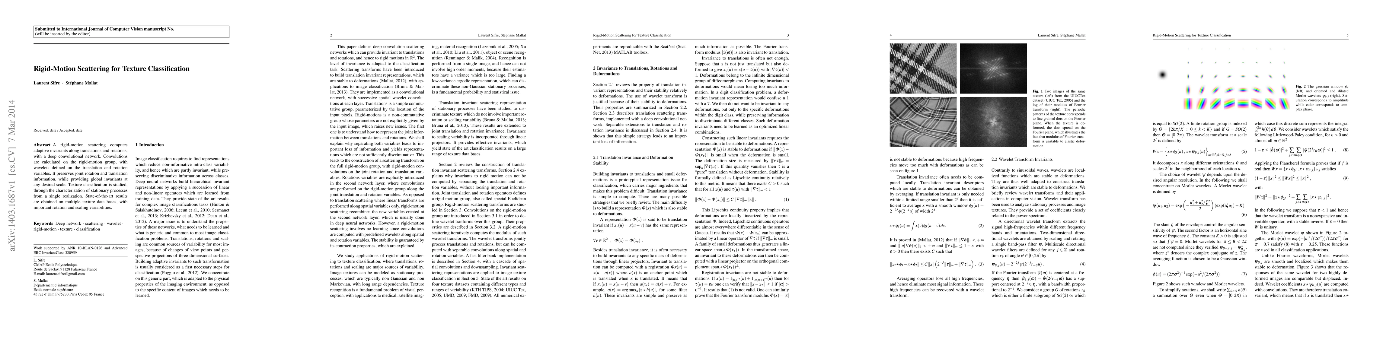 This paper proposes a rigid-motion scattering method that computes adaptive invariants under translations and rotations for texture classification, achieving state-of-the-art results on various texture datasets with significant rotation and scaling variations.