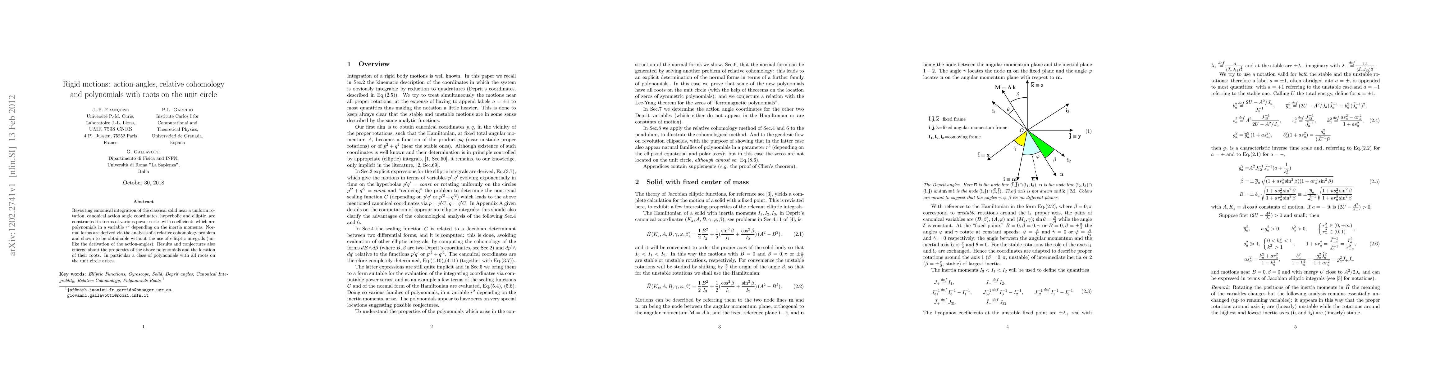 This paper constructs canonical action-angle coordinates for a rotating solid, deriving normal forms without elliptic integrals. It explores relative cohomology and discovers polynomials with roots on the unit circle, proposing conjectures about their properties.