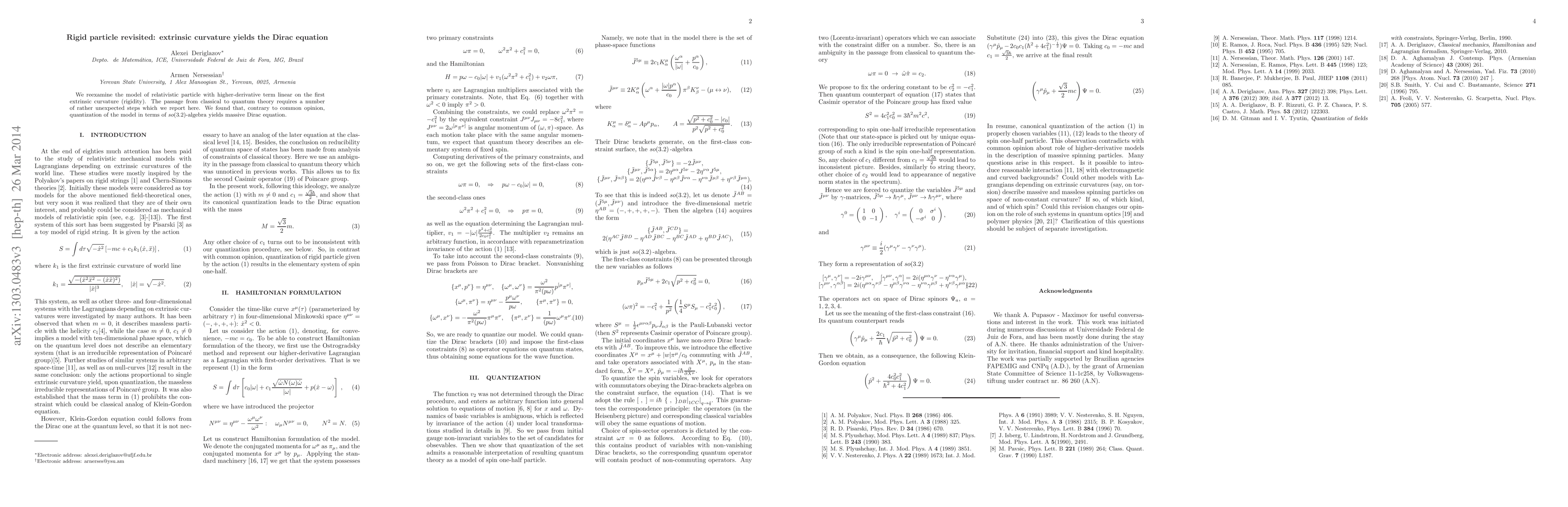 We reexamine the model of relativistic particle with higher-derivative term linear on the first extrinsic curvature (rigidity). The passage from classical to quantum theory requires a number of rather unexpected steps which we report here. We found that, contrary to common opinion, quantization of the model in terms of $so(3.2)$-algebra yields massive Dirac equation.